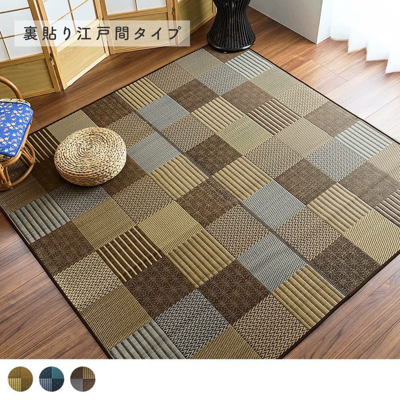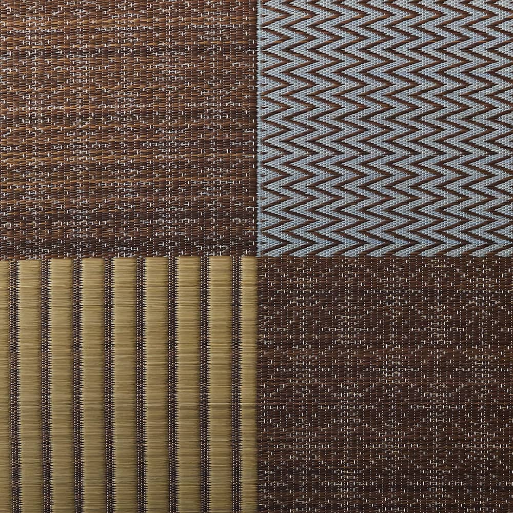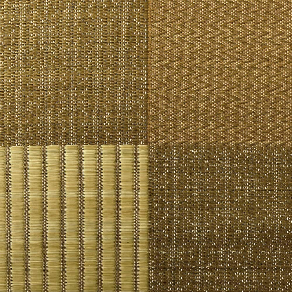 畳の目に見える模様や、縞柄、伝統の刺繍「刺し子」のような点線で表した麻の葉柄。伝統的なさまざまな和紋様を、パッチワーク風に組み合わせたい草ラグです。濃淡の違う同系色を織り交ぜることで、まとまりの良い中にも絶妙なニュアンスをプラス。和の趣をシックにオシャレに、取り入れられる1枚です。