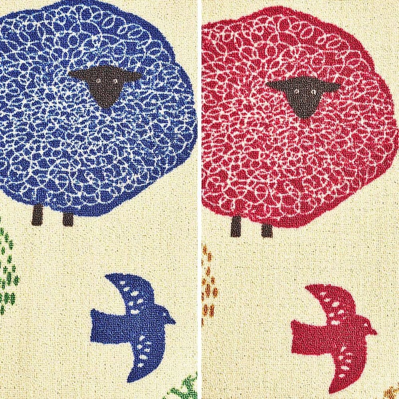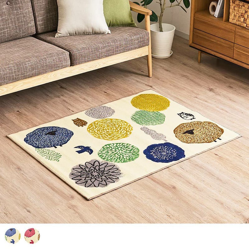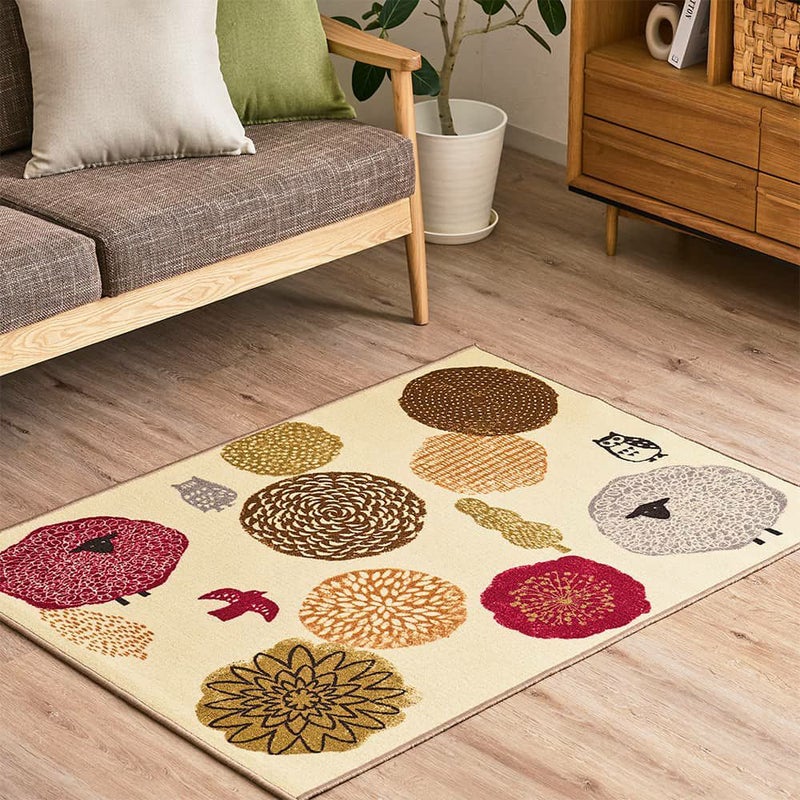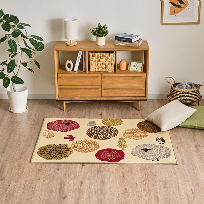 大きな花、ヒツジ、鳥、木、フクロウ、、ほっこり可愛くて、ちょっとレトロな北欧らしいデザインのラグ。こっこりとしたアースカラーがお部屋を上品に彩ります。