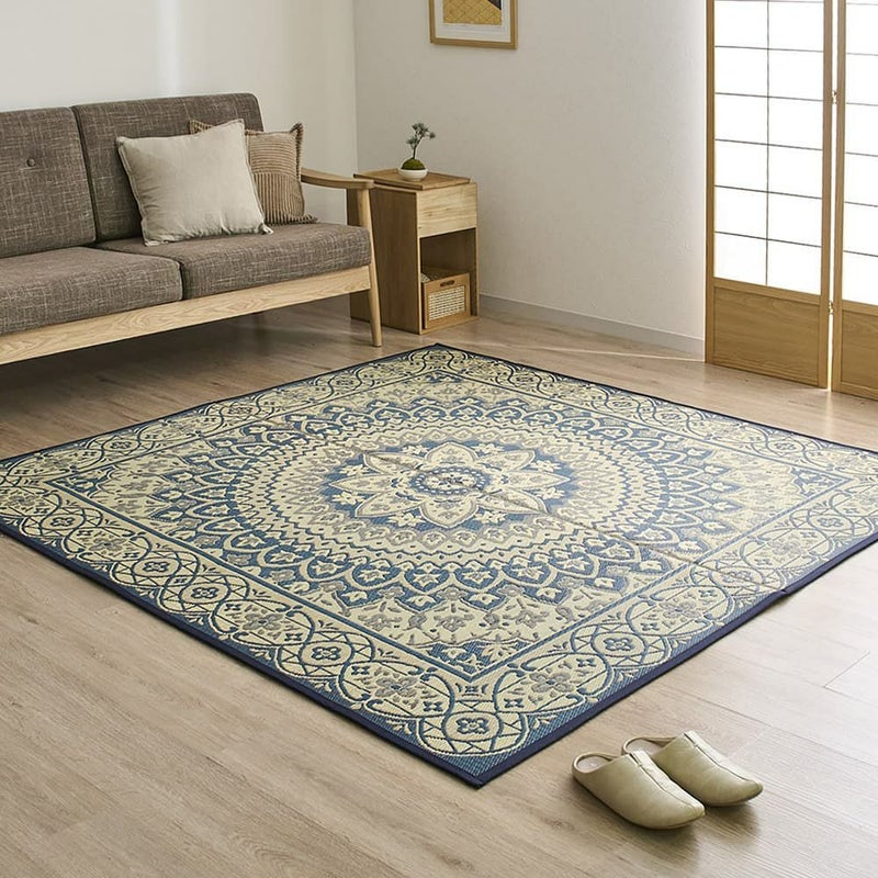 高級感のある絨毯のような柄をい草の織りで巧みに表現しました。一般的ない草ラグよりも飽きのこないデザインでお部屋を華やかに彩ってくれます。