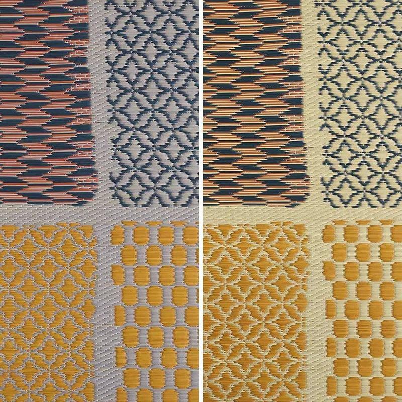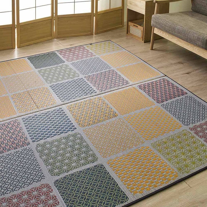 カラフルな配色とパッチワークのようなタイル模様がポップな「市松和紋」。それぞれのタイルのなかにもさりげない和紋がデザインされていて、無地のい草よりもデザイン性に富んだ1枚です。