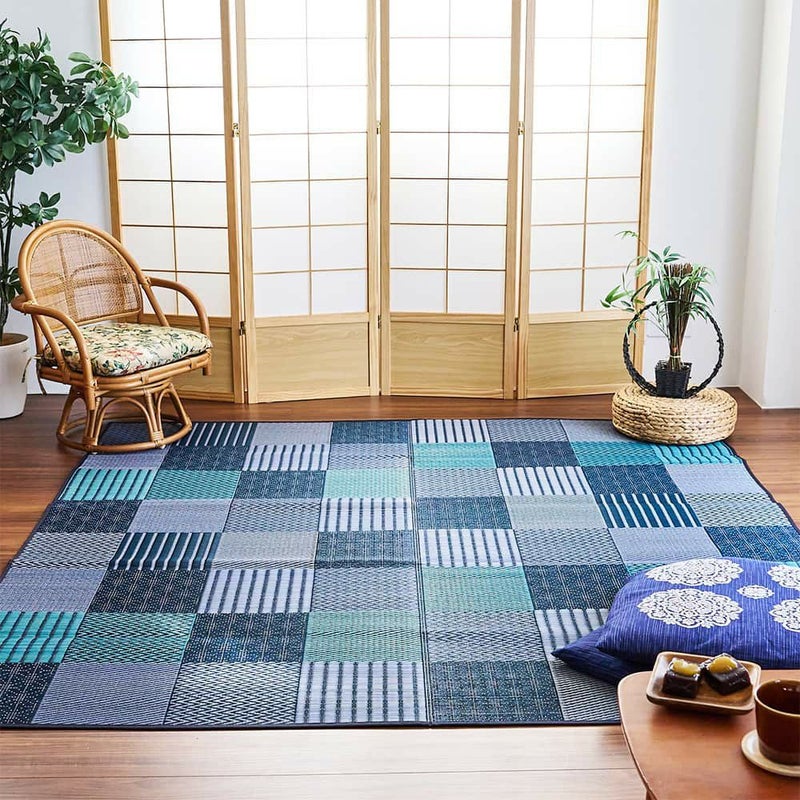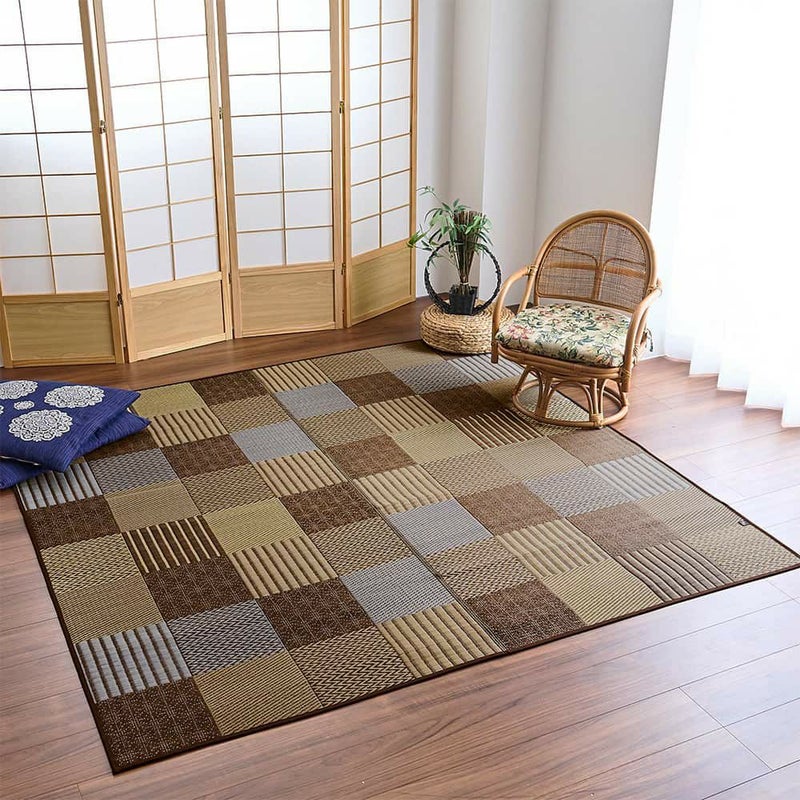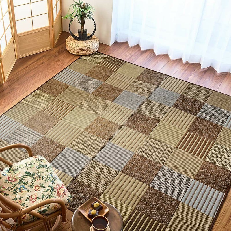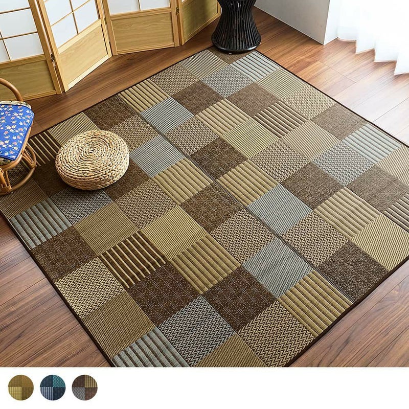 畳の目に見える模様や、縞柄、伝統の刺繍「刺し子」のような点線で表した麻の葉柄。伝統的なさまざまな和紋様を、パッチワーク風に組み合わせたい草ラグです。濃淡の違う同系色を織り交ぜることで、まとまりの良い中にも絶妙なニュアンスをプラス。和の趣をシックにオシャレに、取り入れられる1枚です。