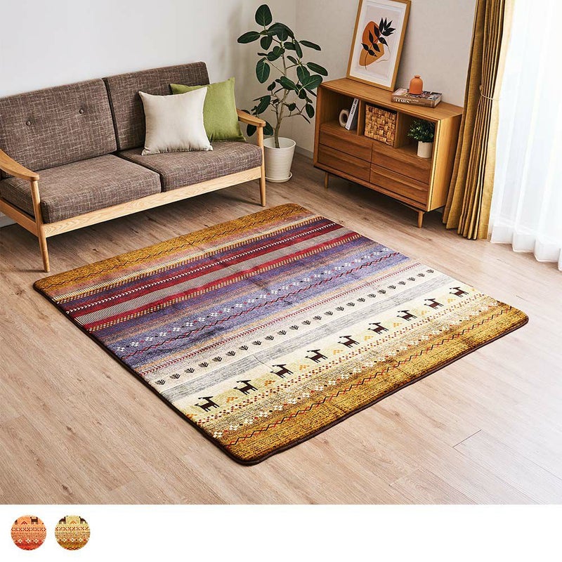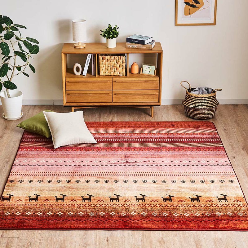人気の民族柄「ギャッベ柄」を、じんわり滲むようなグラデーションとともに表現したラグは、夕映えに溶けていく雄大な自然を思わせます。ウレタンフォームが入ったクッション性も相まって、ゴロンとすればふかふかの草原に寝転んだような夢心地に…◎