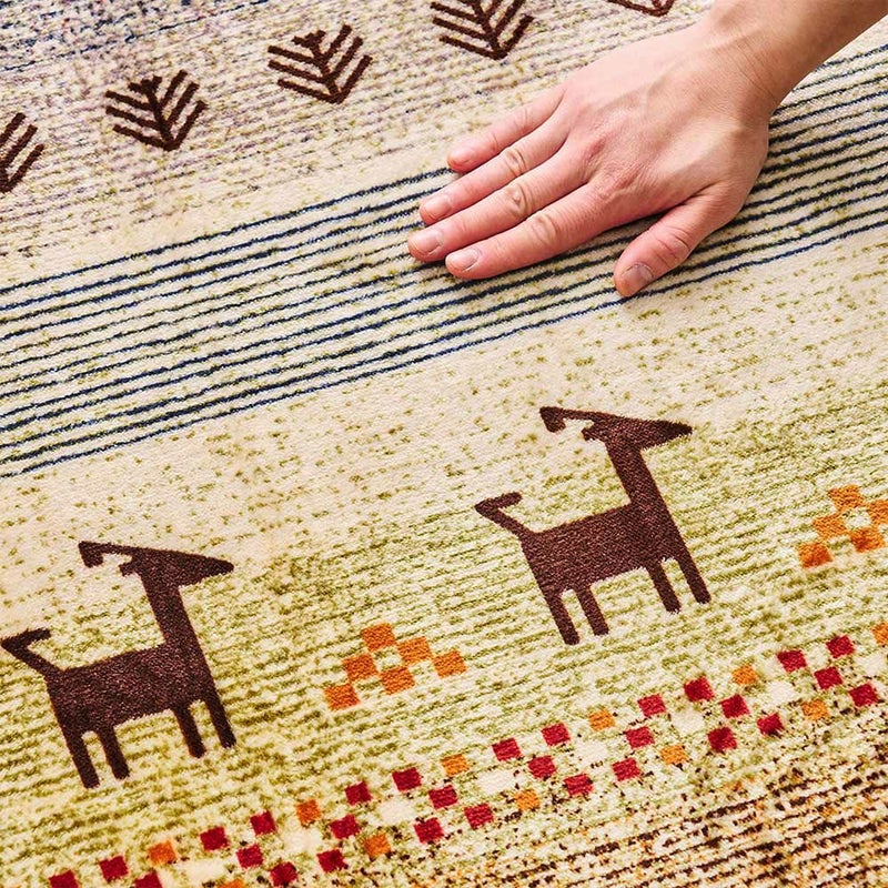 遊牧民の暮らしの中で生まれたギャッベのモチーフには、生命の木や鹿、花などの身の回りの素朴な風景が表されています。優しいデザインと柔らかなフランネル生地が醸し出す、暖かみをお部屋に。