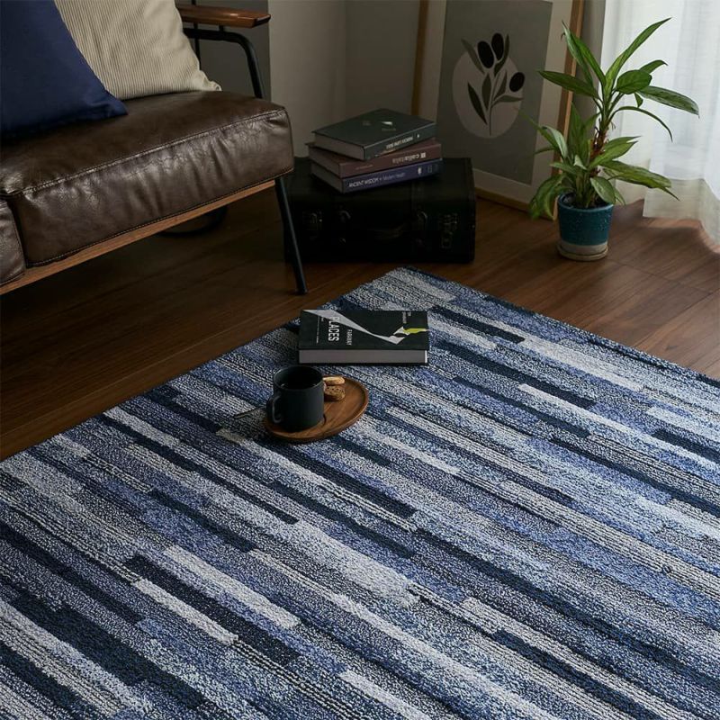 細いレンガを並べたような立体感を感じるデザイン。同色の2色の糸をミックスして色合いに深みを持たせ、モダンやヴィンテージインテリアにもマッチする日本製ラグです。凹凸やコントラストがお部屋に奥行きをもたせ、遊び心のあるインテリアのスパイスとなるでしょう。