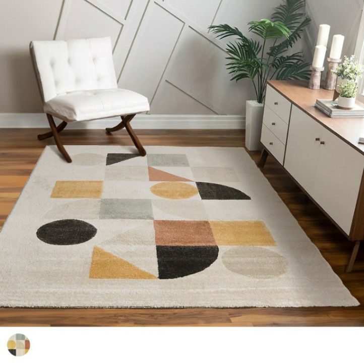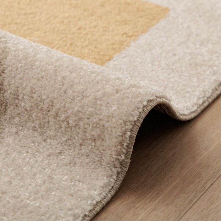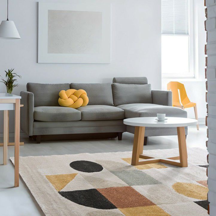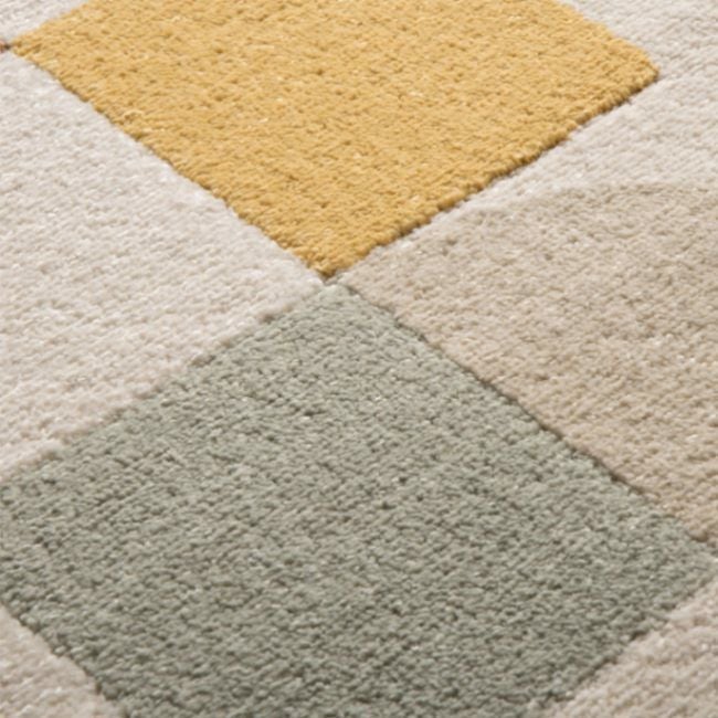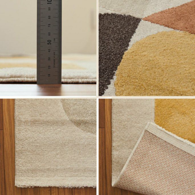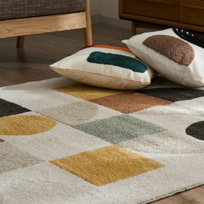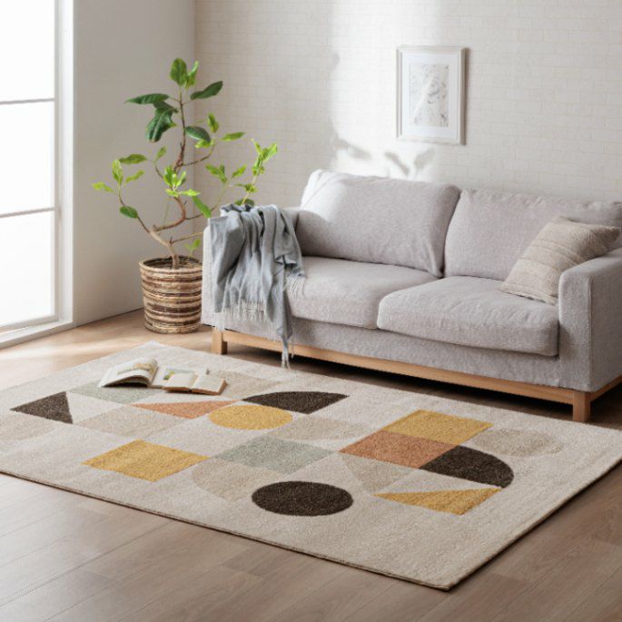 ランダムに配置された幾何学柄のカラフルな色合いがポップで心躍る一枚。カラフルながらも、ヴィンテージ感漂う落ち着いた色使いで、あなたのお部屋を優しく彩りをプラスしてくれます。幾何学柄のディテールもウィルトン織りの柔らかな風合いで、固い印象になりすぎず、柔らかな曲線が温かみを感じる一枚です。
