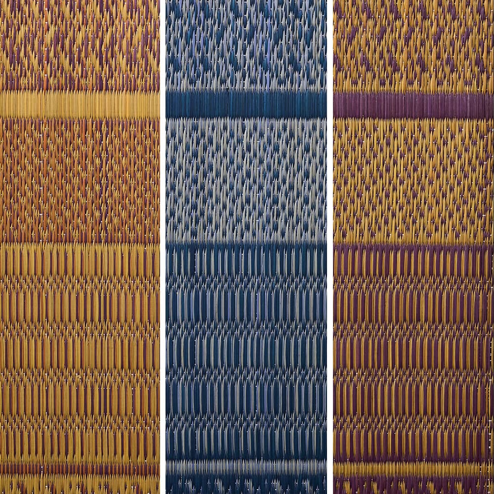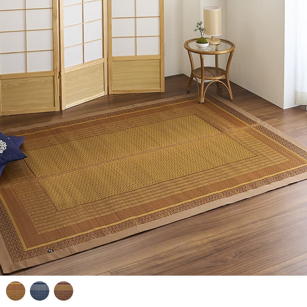 絵柄がくっきり表現できる「紋織り」という技法で織られたい草ラグ。奥深い色合いが表現された3色からお選びください。