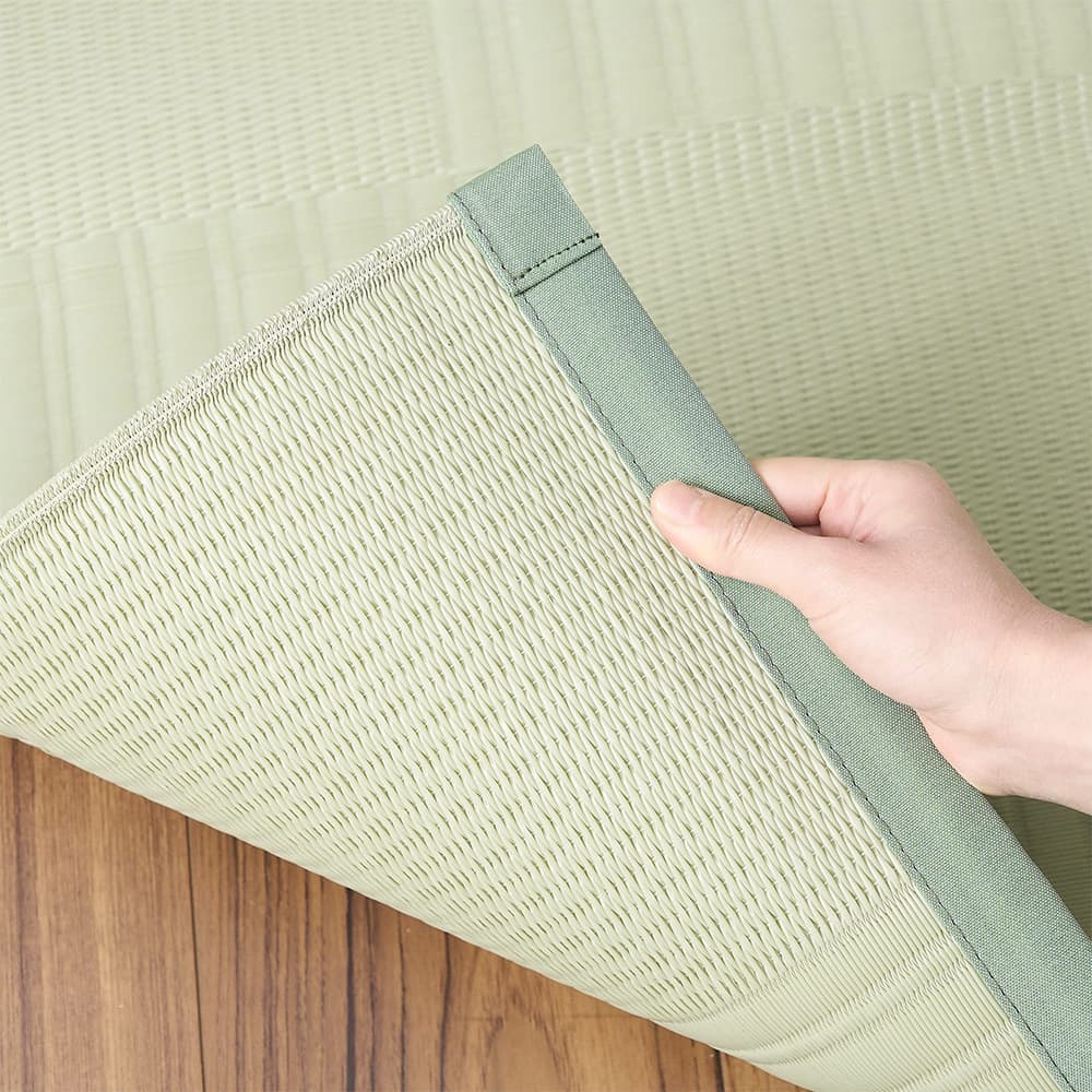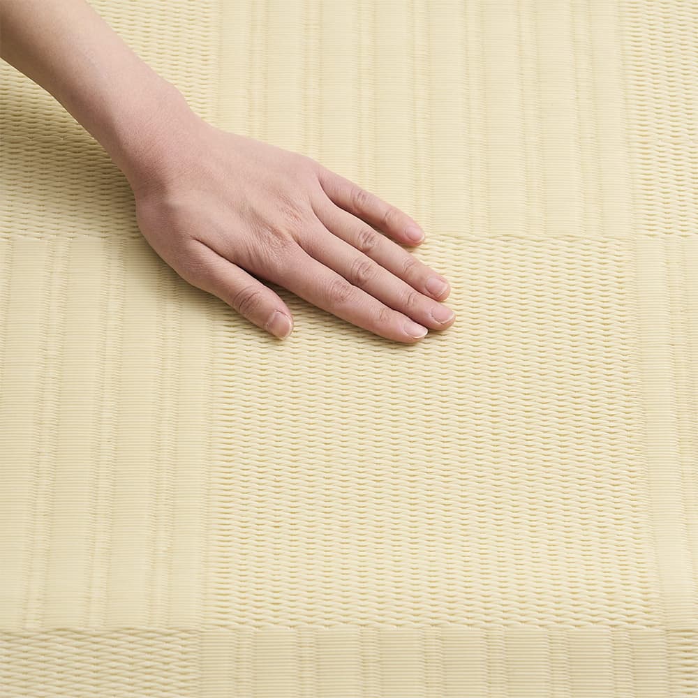 丈夫で汚れに強い素材のポリプロピレンを、い草のござのように織り上げた1枚。暑い日にもずっと触れていたくなるような、サラッと快適な手ざわりが魅力です。