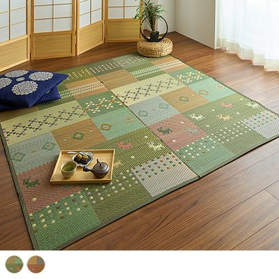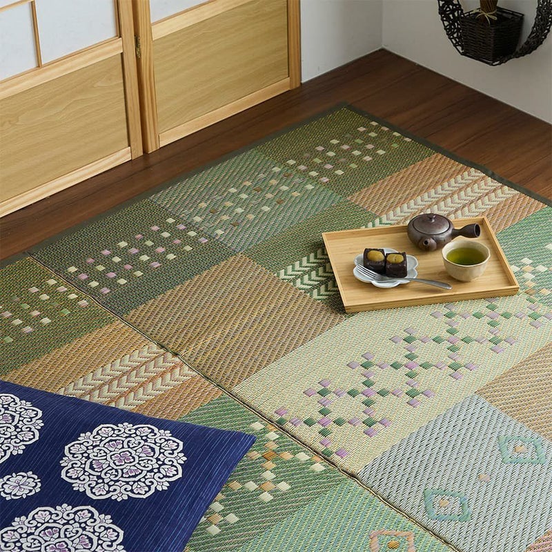パッチワークのようなカジュアルなデザインが、今までのい草ラグのイメージとはひと味違った和室にも洋室にも合わせやすいデザイン。人気の和モダンテイストにも是非取り入れたい1枚です。