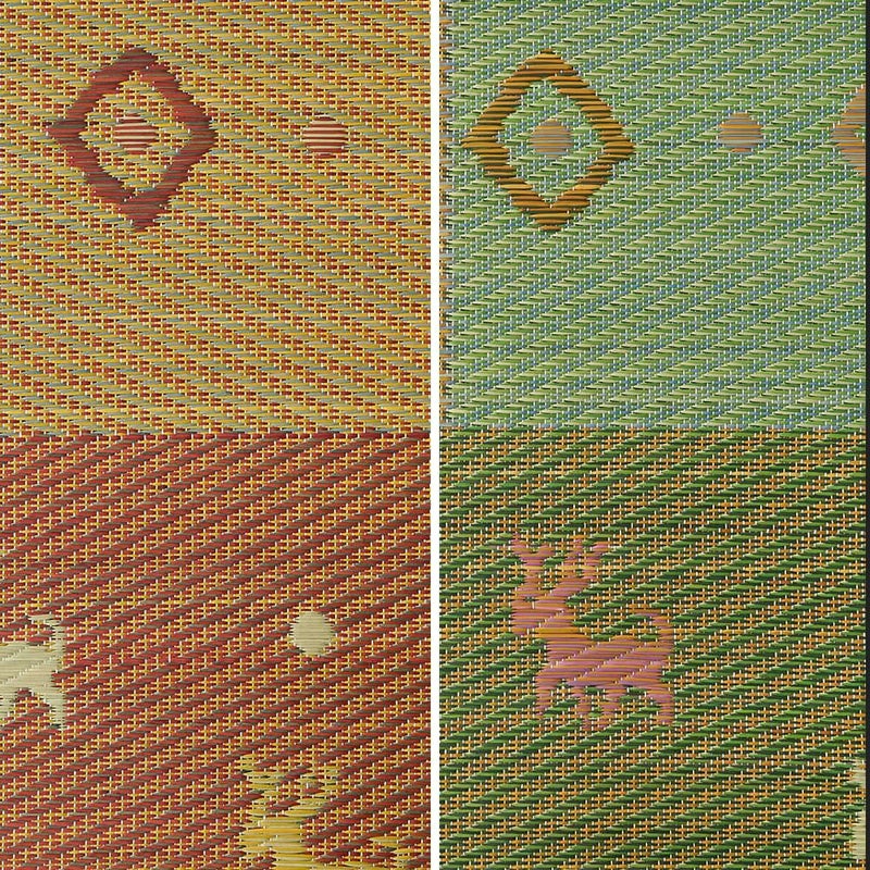 ギャッベ柄のカラフルさを落とし込んだ賑やかなレッド、畳やござ本来のイメージに近い緑を基調としたグリーン。あなたの好みのカラーをお選びください。