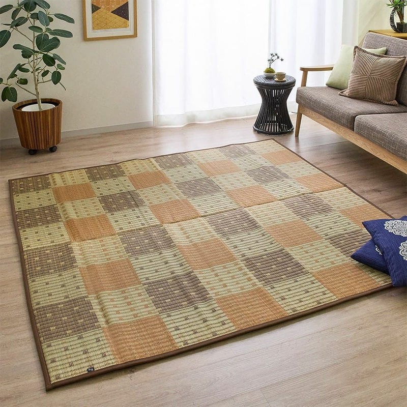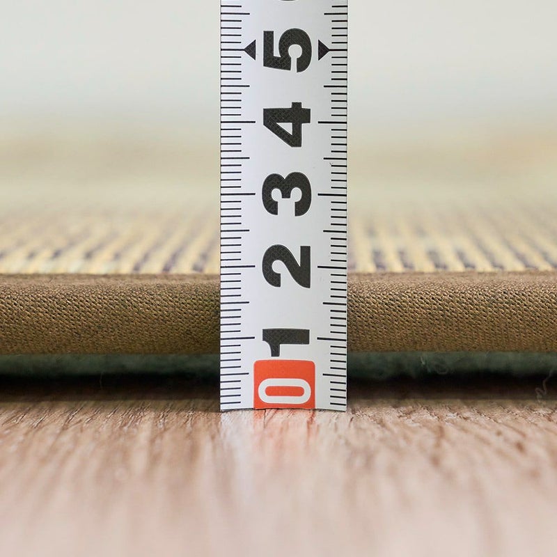 部屋なじみの良いブロック柄にメーカー独自の技術で圧縮した裏地を貼り合わせたい草ラグです。空気をたくさん含んだ約15mmのボリューム感ある裏地は、防音効果も抜群でお子様がいるお家にもおすすめの1枚。思わずゴロンとしたくなるクッション性をお楽しみください。