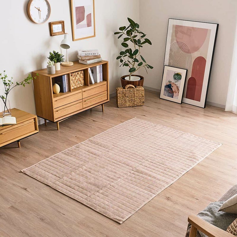 優しく自然体な様子が、カジュアルなお部屋に似合うキルト柄。そこにさり気なく人気のヘリンボーン柄を仕込んで、ニュアンスを出した1枚です。サッと気軽に敷ける、シンプルさと軽量さも魅力!