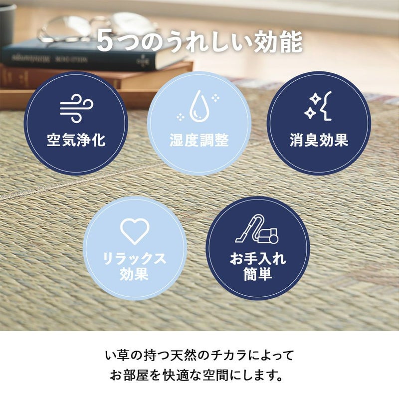 消臭効果や空気清浄効果のある「い草」と高い抗菌力を持つ青森県産「ヒバ油」加工の組み合わせで、毎日を快適に。安心安全にお使いいただける、国産い草ラグです。
