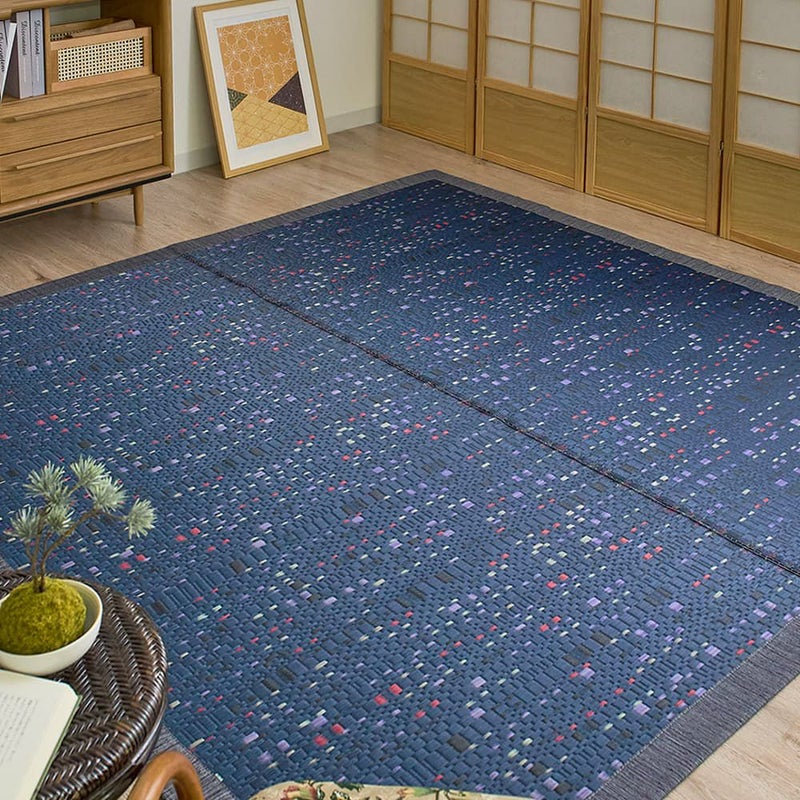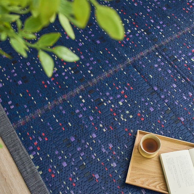 1畳あたりに厳選したい草を4000本以上と、通常よりもたっぷりと使用することで柄をより繊細に表現しました。重厚感のあるベースカラーに複数の色味が散りばめられており、シンプルすぎない大人の遊び心をくすぐる大人モダンのい草ラグです。