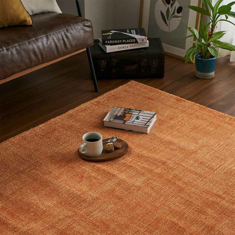 目の詰まったラグなので、埃や汚れが奥まで入っていかず、ラグの表面に留まるので、お手入れもしやすいです。また厚みがしっかりとあり、踏み心地もよく耐久性があります。