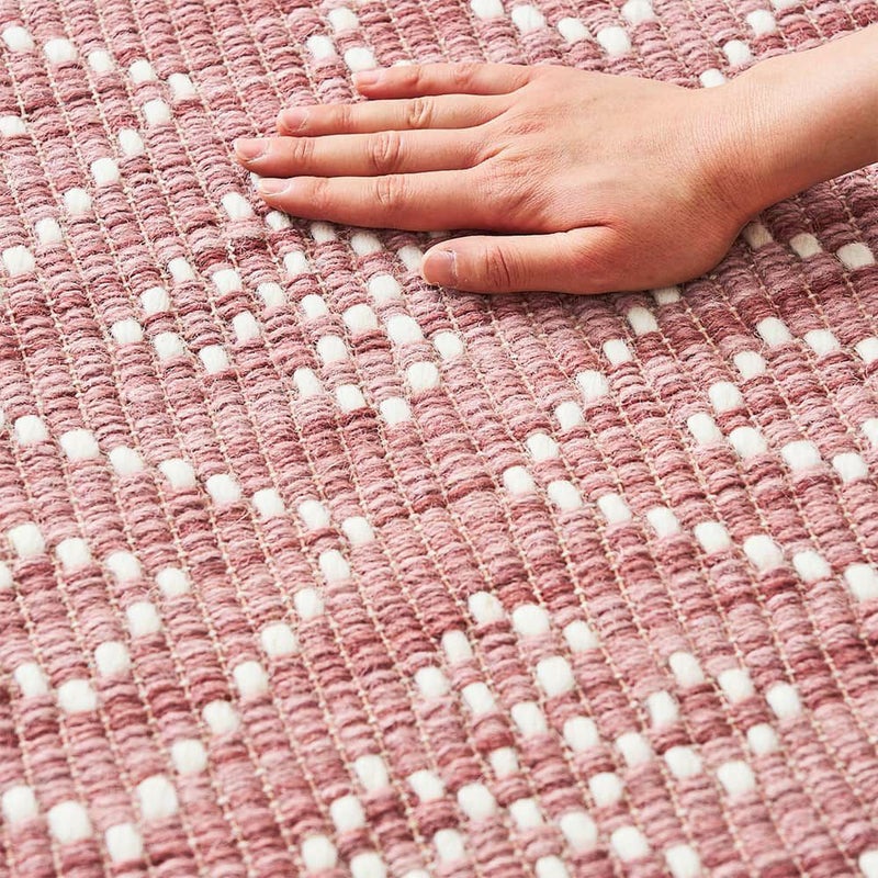 手織り機で一枚ずつ丁寧に仕上げられたハンドウィーブラグ。シンプルながらも存在感のある幾何学模様は手織りならではのざっくりとした織り目と、ウールの素朴な風合いがたまりません。お部屋に心地よい安らぎを与えてくれます。