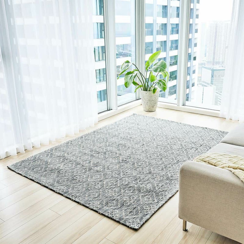 日本の小紋や石目のようにも見える、シンプルで飽きが来ない飽きが来ない幾何学模様のデザインラグ。すっきりとした印象なので、一枚敷くだけでお部屋がモダンでスタイリッシュな雰囲気に早変わり!