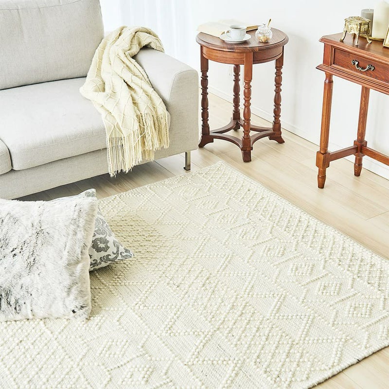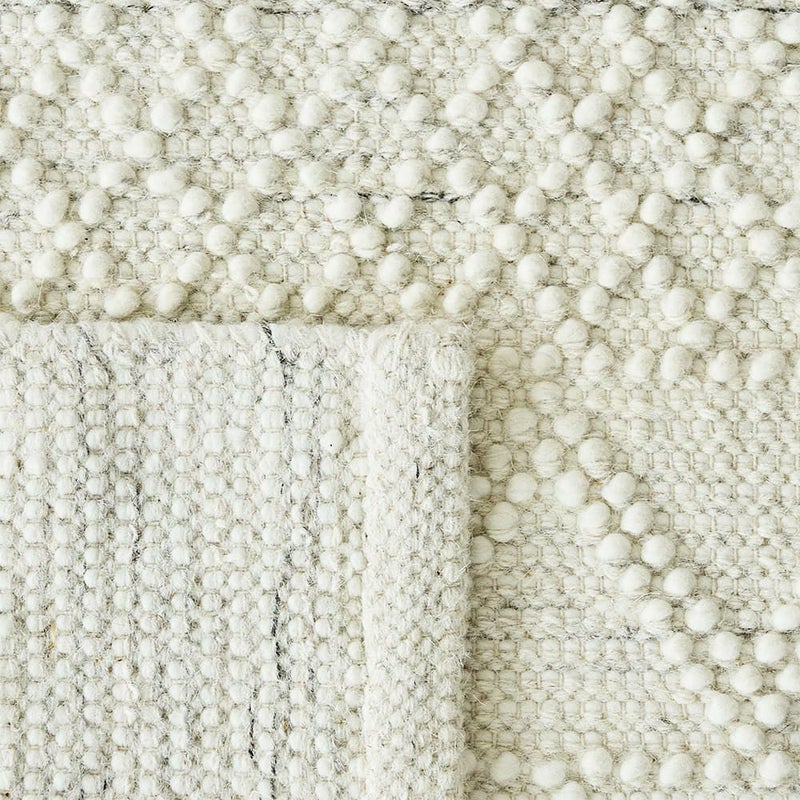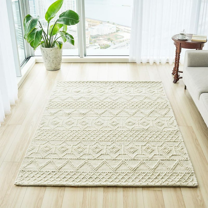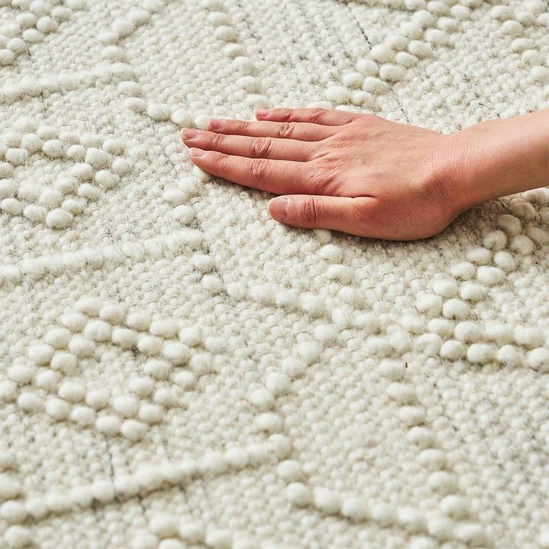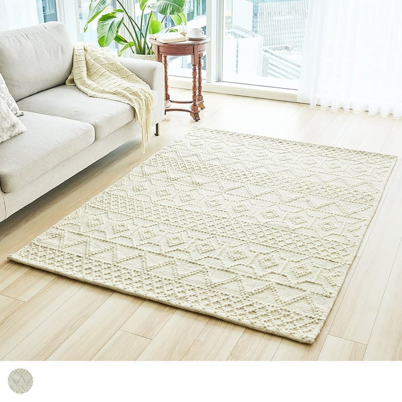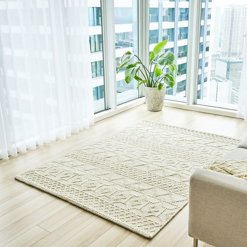 ナチュラルなアイボリー色の単色に、立体感のある織り模様がアクセントとなって素朴な味わいが魅力のラグです。手織りならではのざっくりとした織り目と、表情豊かなテクスチャーが心地よくお部屋に温もりを与えてくれます。