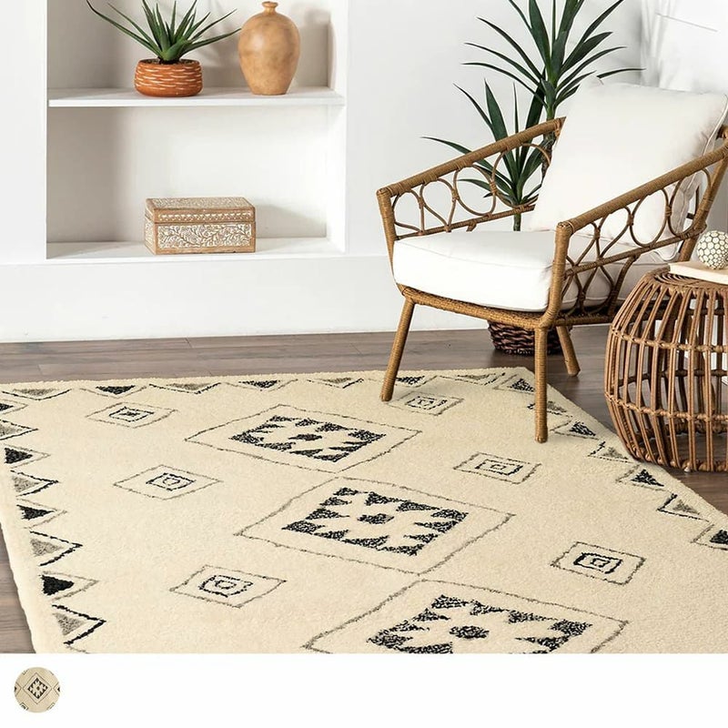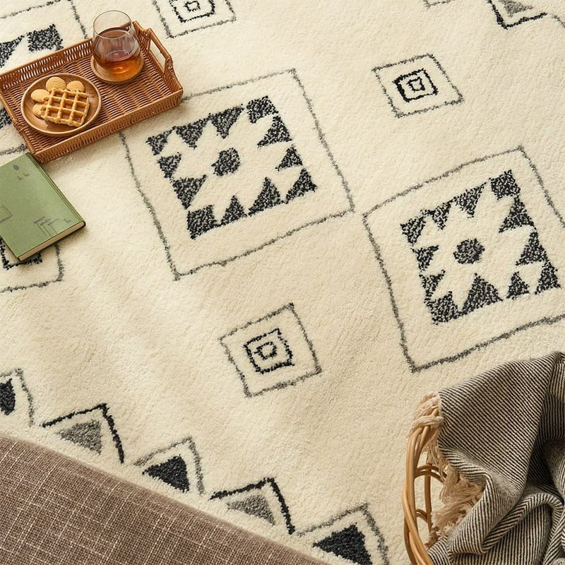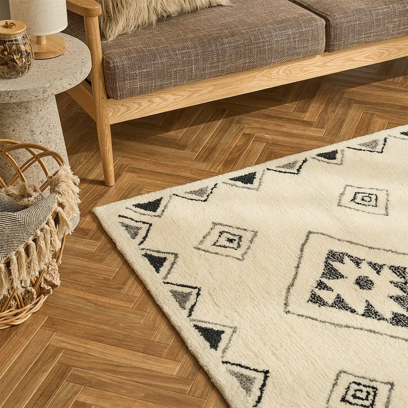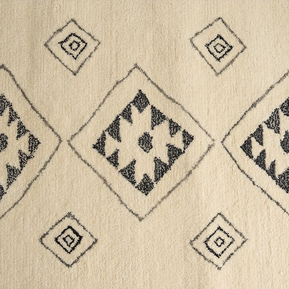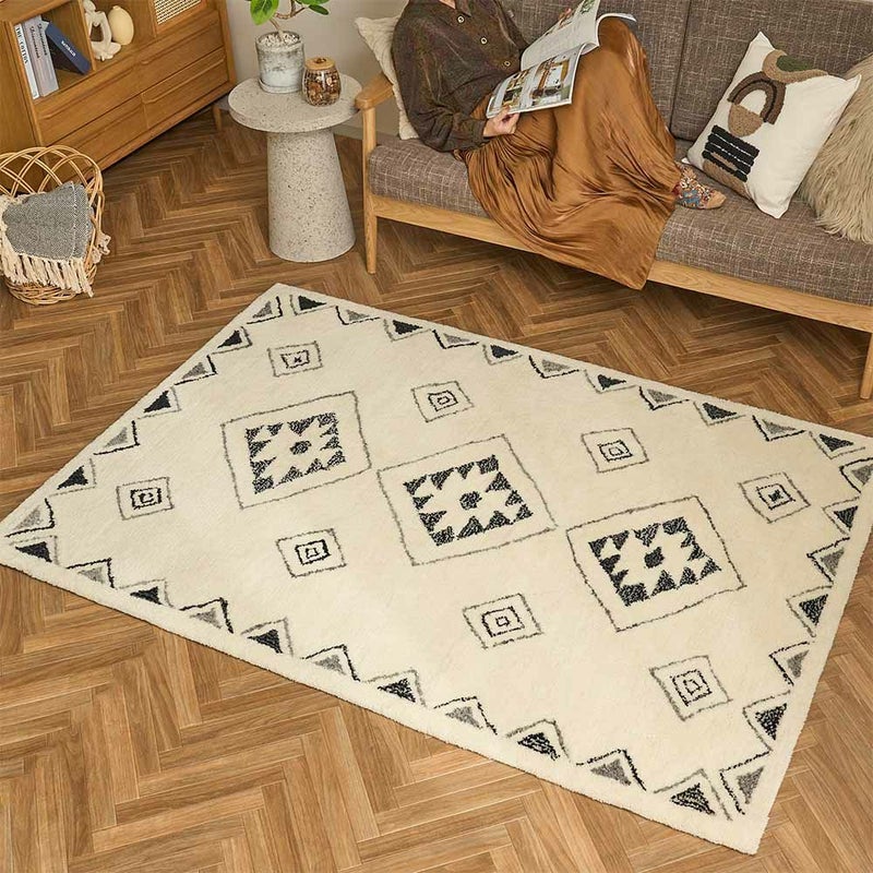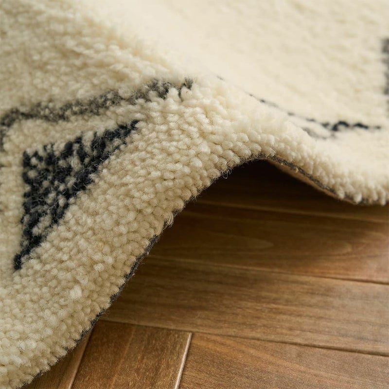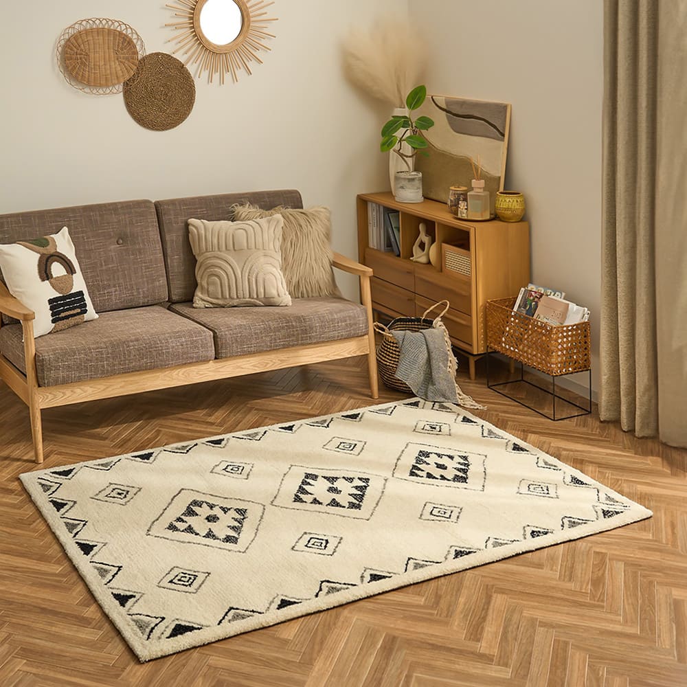 手で描いたようなラフなデザインにほっこり癒されるエスニックラグ。モコモコと包み込まれるような肌触りが心地よく、ウール100%で肌に優しい天然素材なのも嬉しいポイント。あなたのお部屋に個性をプラス!
