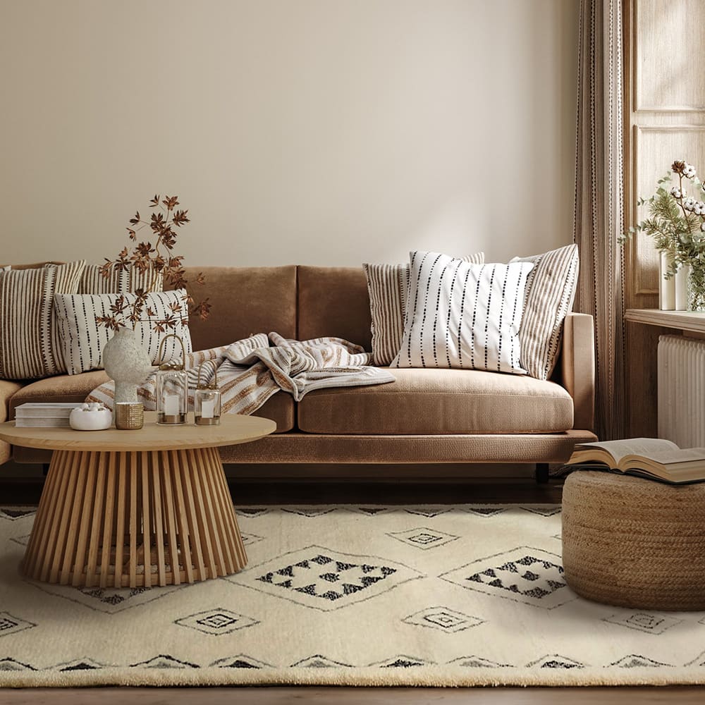 民族調の手描きのような温かな模様。個性的なデザインでも、お部屋に遊び心を加えつつもスッと馴染む不思議な魅力。ユニークで可愛らしいデザインがお部屋に程よいアクセントを加えてくれるのです。