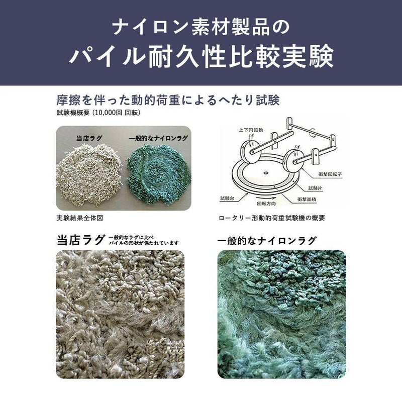 ラグを長く使っていくとどうしてもへたってきますよね?ジャスパーならそのへたりもしっかり解決!ナイロン100%の素材は、弾力性があり形態安定に優れています。やわらなかな肌触りもナイロンラグならではでクセになる仕上がりです。