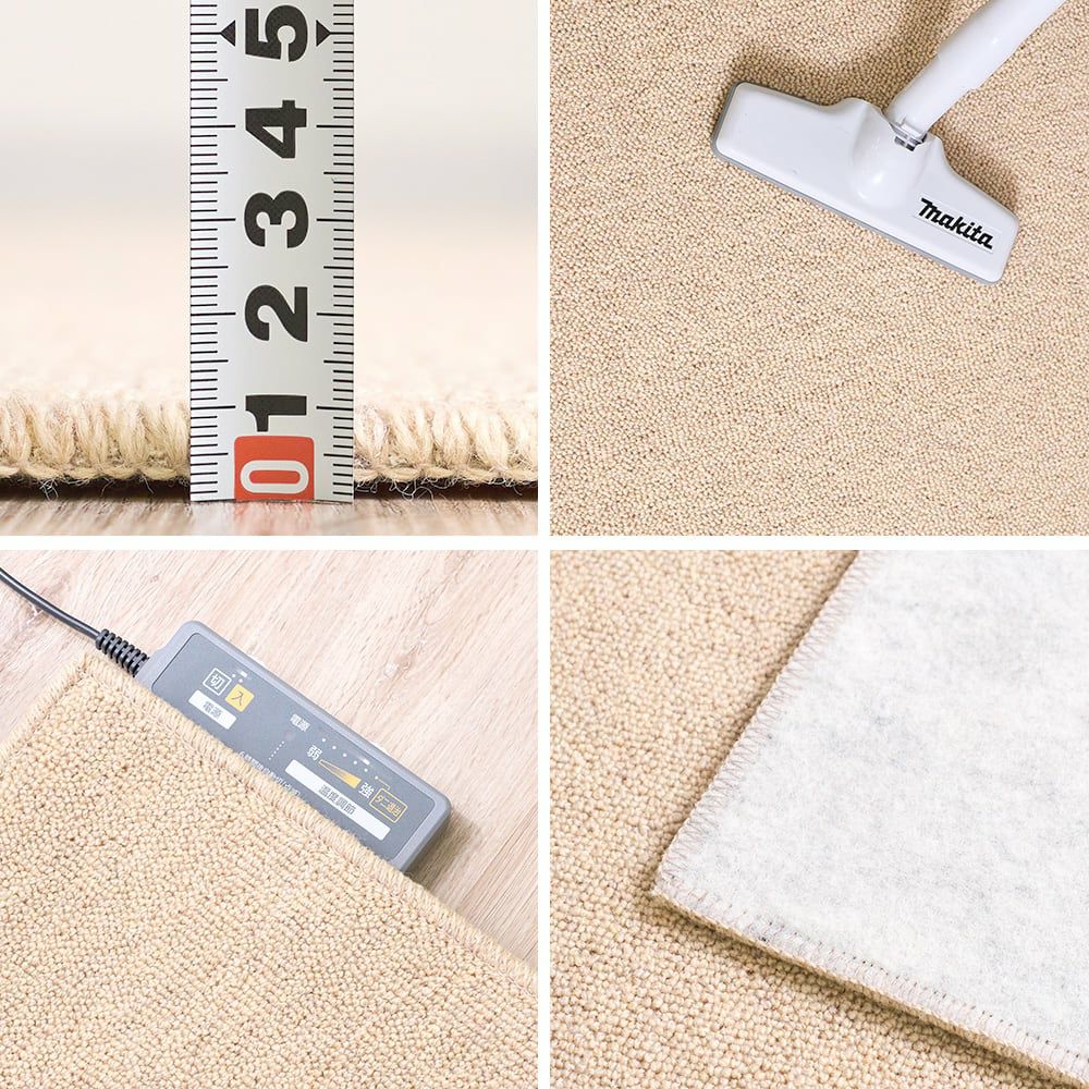 やや薄手でありながらもしっかりと作られたカーペット。毛足が短いので毎日のお手入れも簡単です。ホットカーペットや床暖房にも対応しているのも嬉しいポイント。