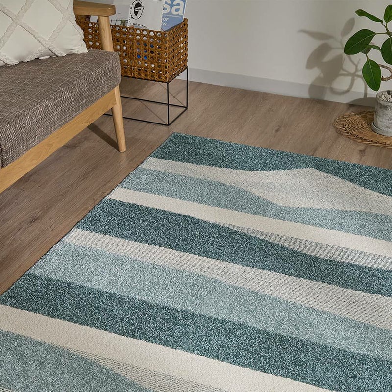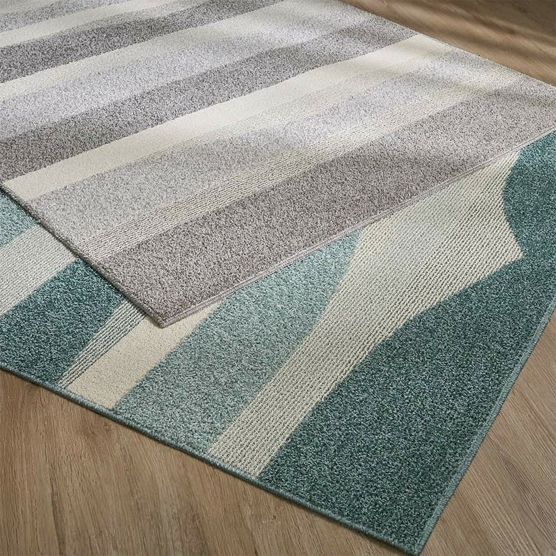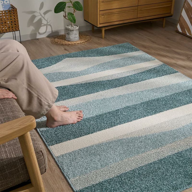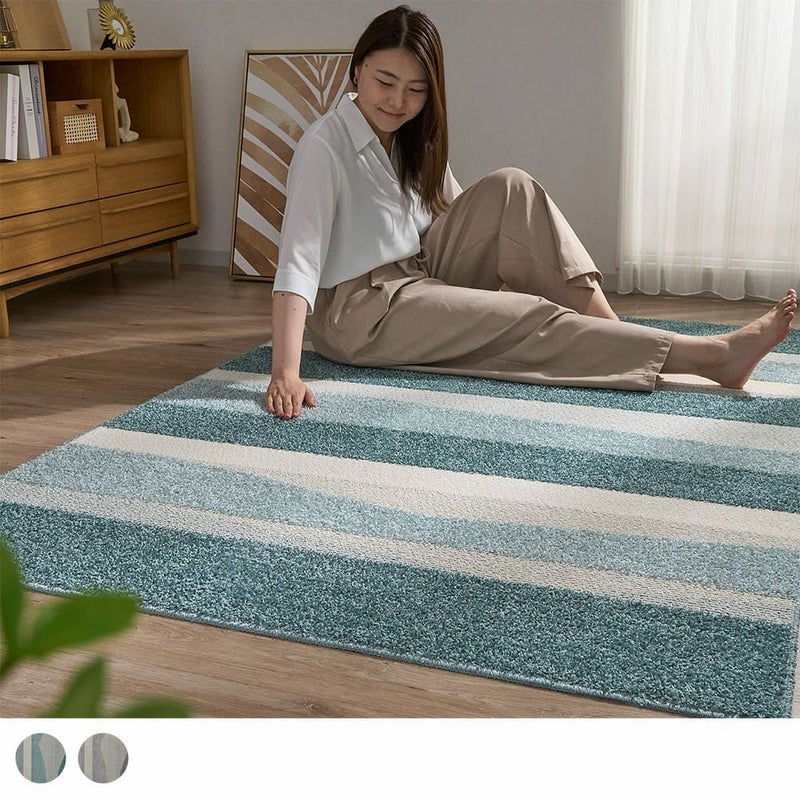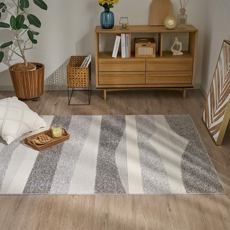 ランダムに重なるボーダー柄が、お部屋にさりげないアクセントを添える一枚。直線的なラインが空間にリズムを生み、敷くだけでリビングがすっきりした印象に。特に、広がりを出したいダイニング横におすすめ。ナチュラルな家具や明るめのフローリングと合わせると、より軽やかな印象に仕上がります。