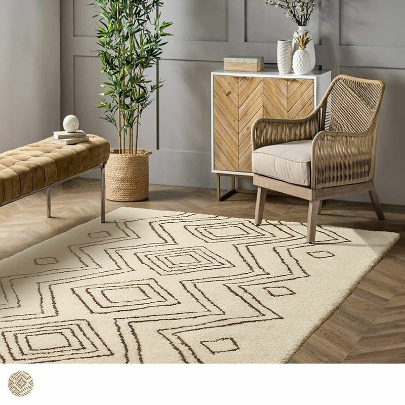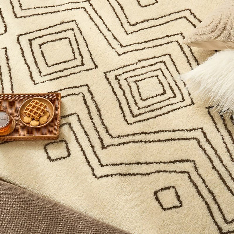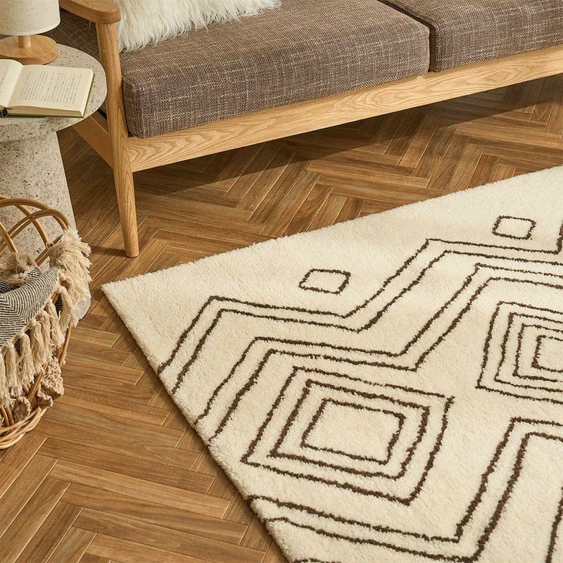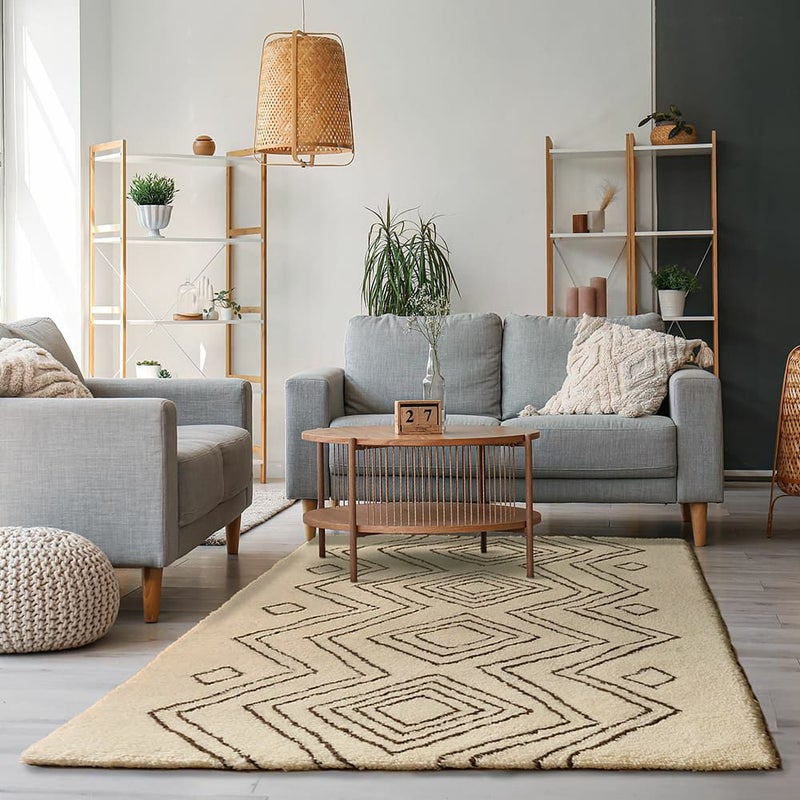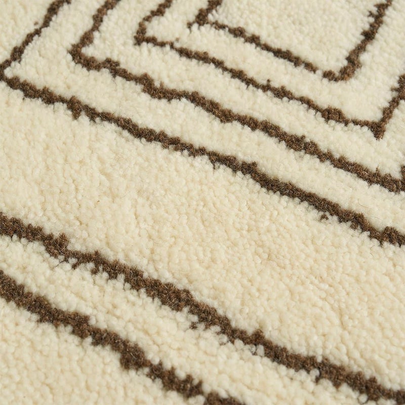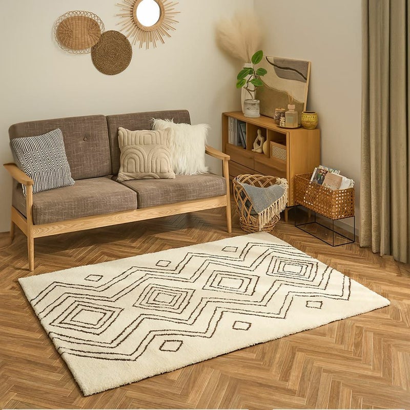 手で描いたようなラフなデザインにほっこり癒されるエスニックラグ。モコモコと包み込まれるような肌触りが心地よく、ウール100%で肌に優しい天然素材なのも嬉しいポイント。あなたのお部屋に個性をプラス!