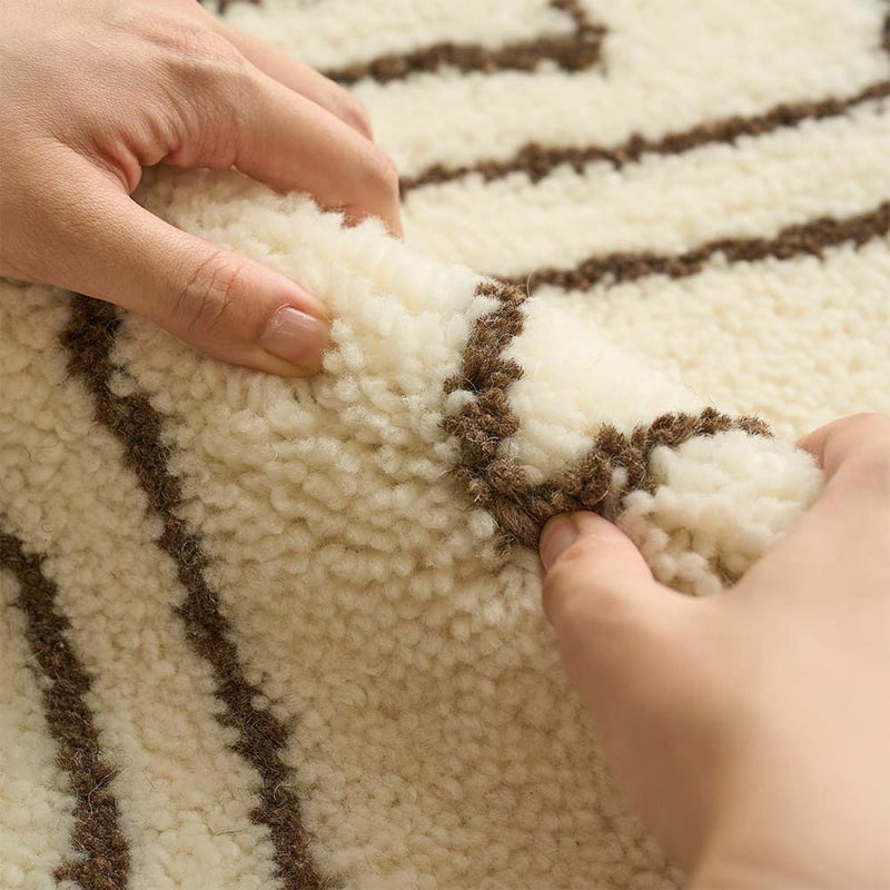 太めのウール糸がしっかりと密度の詰まった仕上がりで、足を踏み入れた瞬間、優しく包み込む極上の足触り。思わず寝そべりたくなるような、心地よい肌触りに魅了されます。