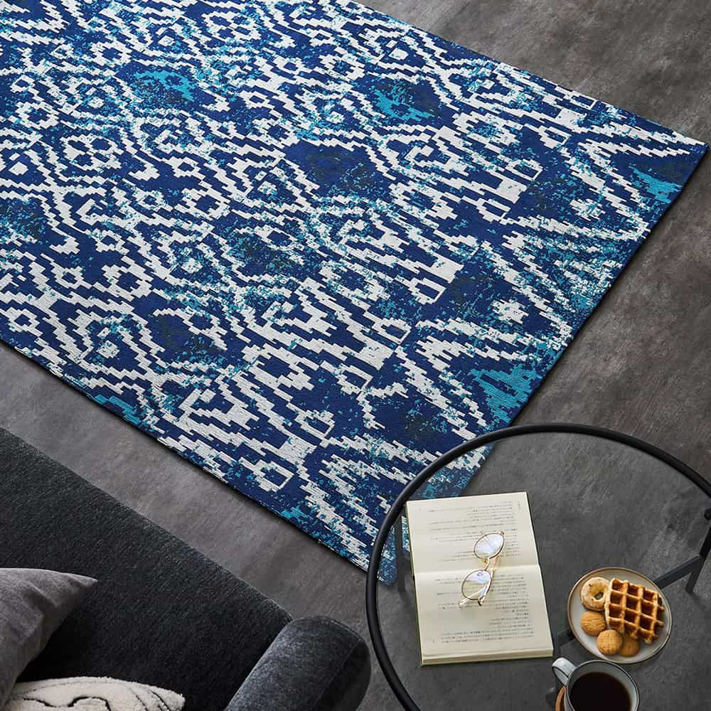 まるで波のように見える幾何学模様が印象的。一枚置くだけで空間を一新してくれます。奥深い色合いのブルーは、明暗の異なるブルーを使い分けたこだわりの仕上がりです。