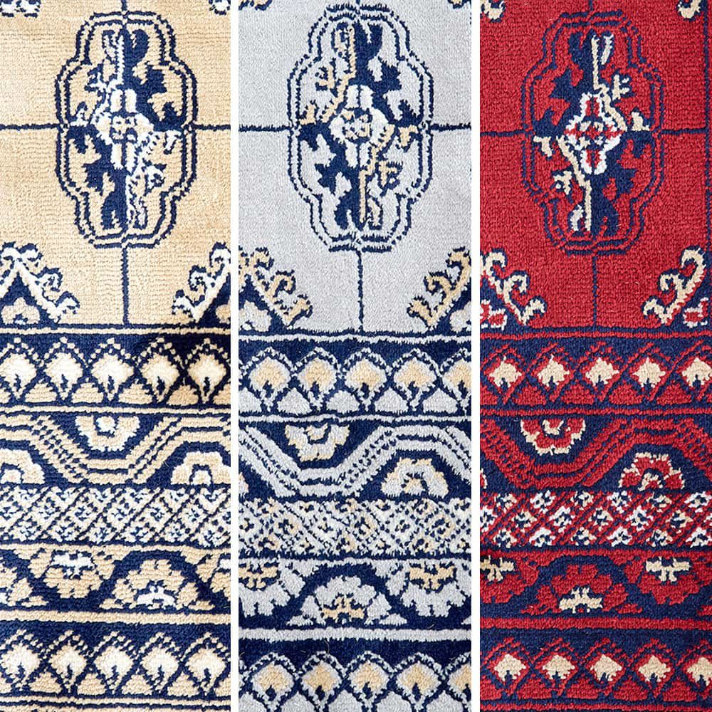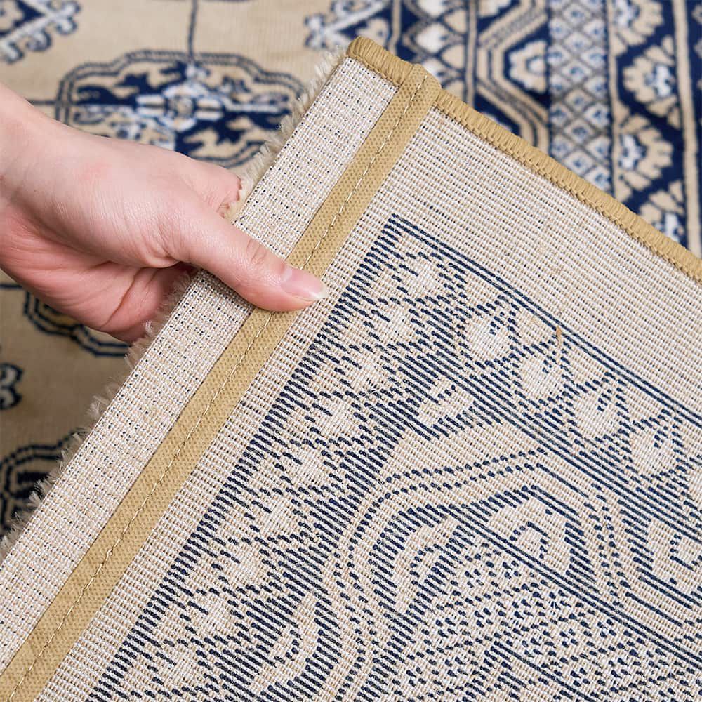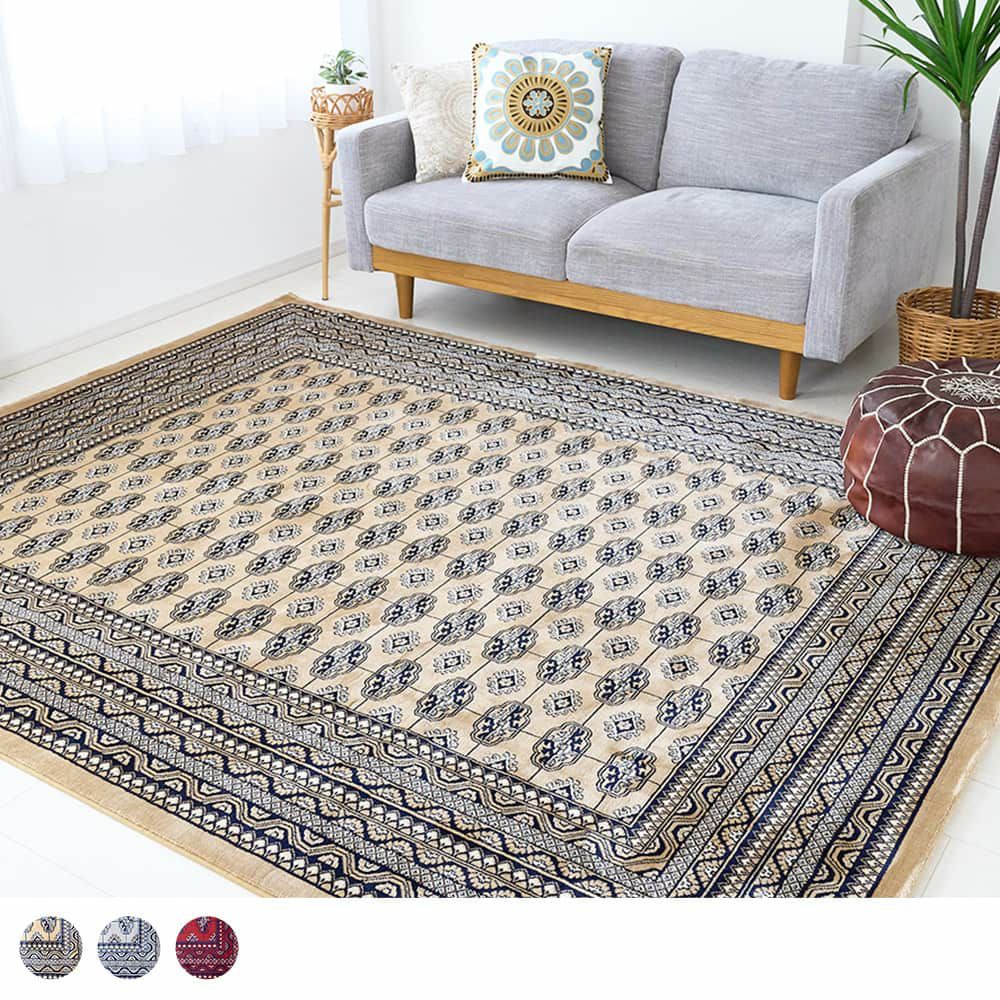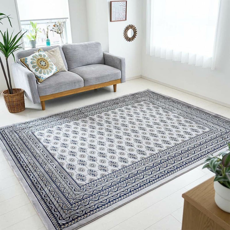 古くから遊牧民の間で愛され織り継いできた伝統的なボハラ模様を、落ち着きのある上品な色合いで仕上げたペルシャ絨毯風ラグ。ボハラ模様のデザインは一柄一柄細部にこだわって織られており、高級感ただよう仕上がりです。