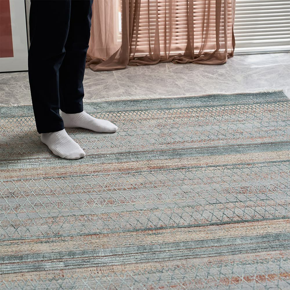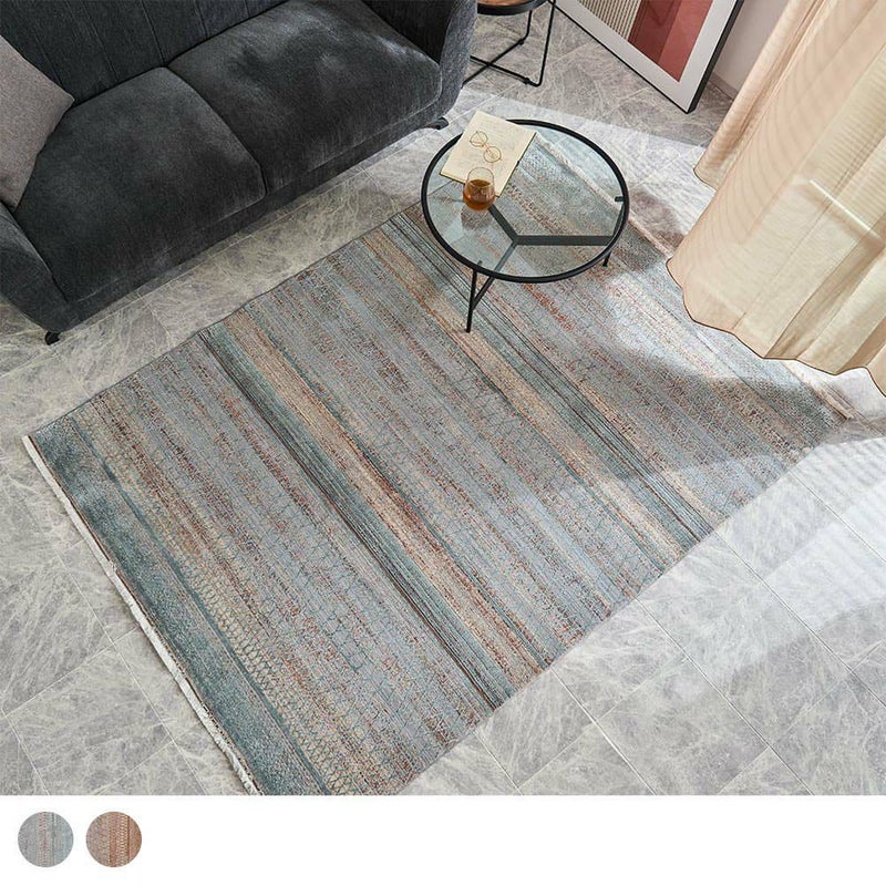 落ち着いたカラーリングが魅力なモダンラグ。やさしいカラーのブルーは爽やかな印象にも。アースカラーのブラウンはナチュラルで落ち着いた雰囲気へ。どちらを選んでも失敗しない素敵な色合いです。