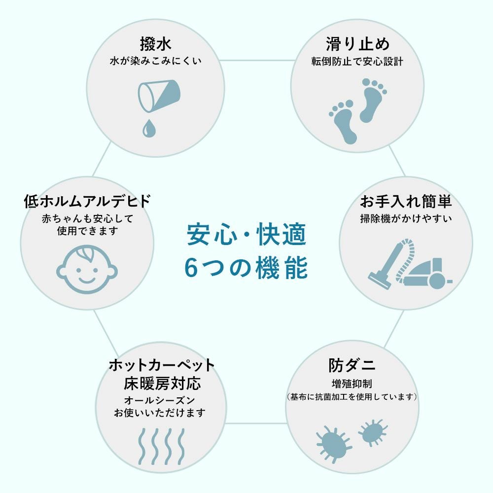 洗濯機で丸洗いできるラグや、撥水機能付きのものなどがございます。裏に滑り止め機能がついているのだと走り回っても転んだりしにくいので、より安心してお使いいただけます。撥水加工、折りたためてリバーシブルで使えるプレイマットなどもご用意ございますのでご相談ください。