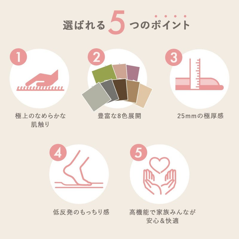 小さなお子様も安心して使える機能はもちろん、滑らかでやみつきになる肌触りともっちりとした踏み心地が自慢の「シェスタ」。ラグを敷けば、疲れて帰った日も、踏み込んだ瞬間に自然と心が和らぎ、温かな空間が広がります。「シェスタ」と共に、心落ち着くひとときを味わいませんか?