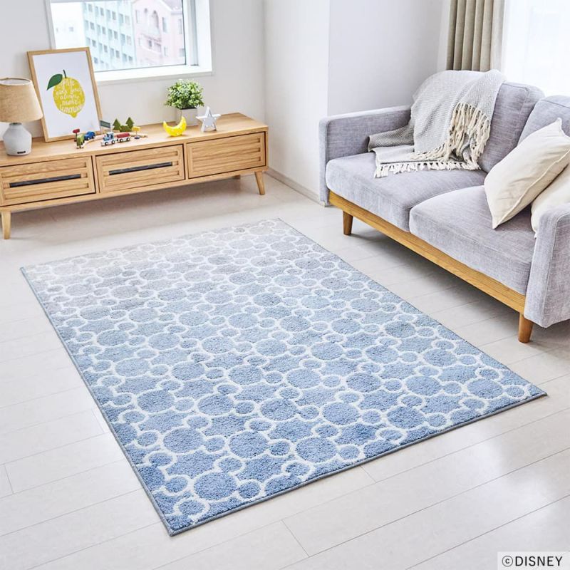 たくさんのミッキーが特徴的なデザインラグ。爽やかなブルーはお部屋を明るくみせる効果も◎