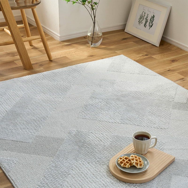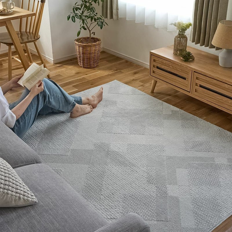 家族が集まるリビングに、ほんの少し奥行きを与えてくれる幾何学模様。主張しすぎないデザインだから、インテリアにすっとなじんで、生活感もふんわりカバーしてくれます。洗濯機で丸洗いできるから、お子さんの食べこぼしやペットの抜け毛も気にせず、気軽にお手入れ。