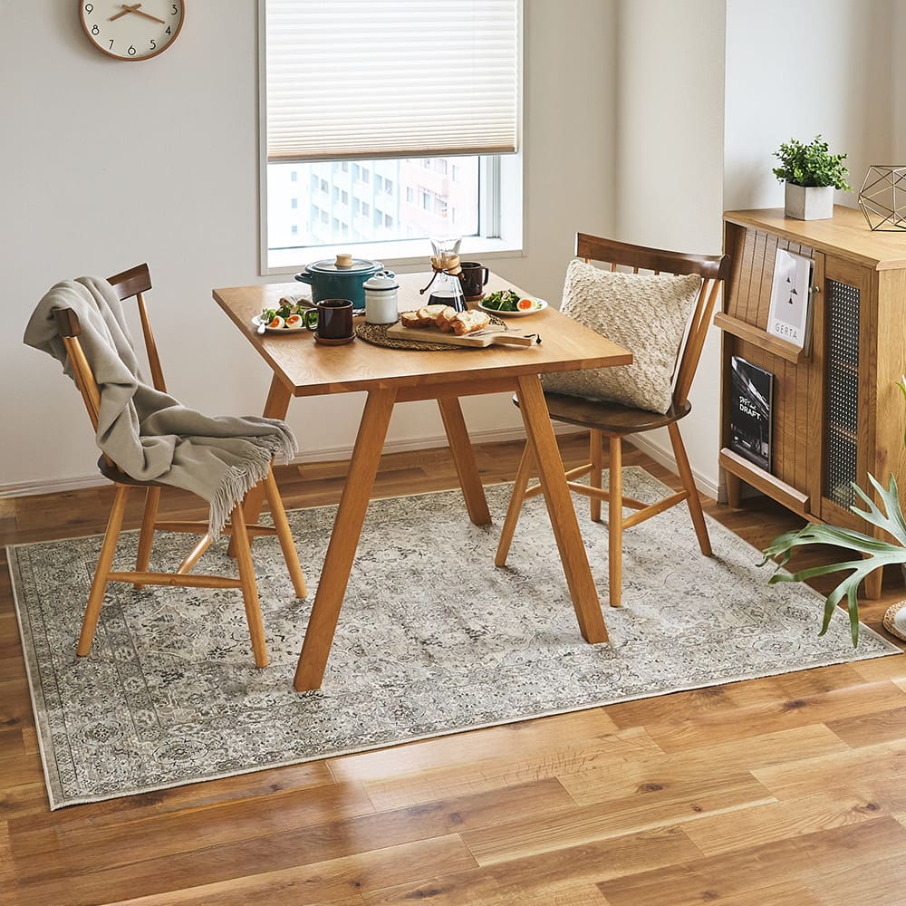 耐久性に優れたモケット織りで織られているので、テーブルや椅子をずらしても毛が抜けにくく綺麗な風合いを保つことができのも魅力の一つ。お気に入りのインテリアを摩擦を気にせず、自由にコーディネートをお楽しみいただけます。