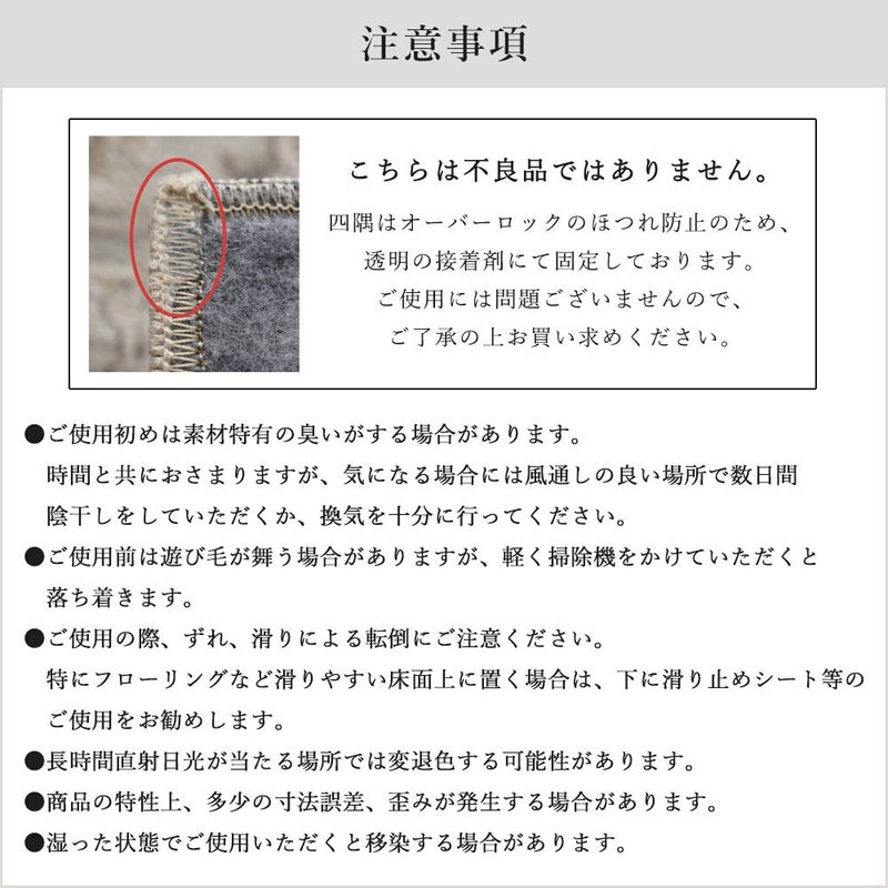 縁にはオーバーロック加工を施しており、細部にまでこだわった丁寧な仕上がりに。ラグの角も直角に近いのでお部屋をよりスマートに演出します。