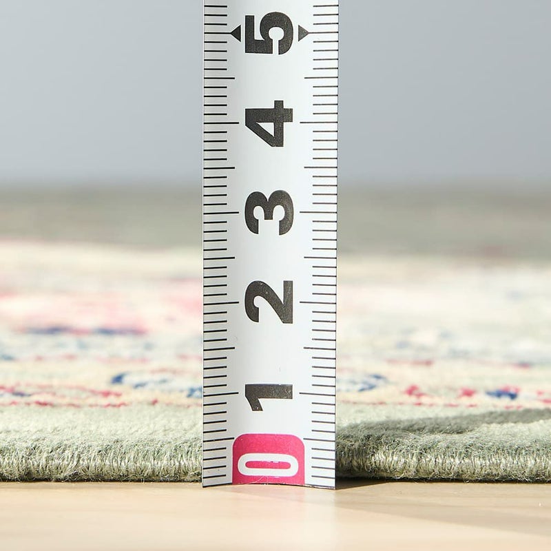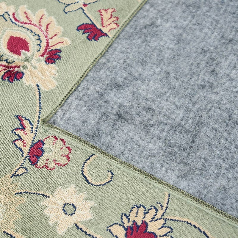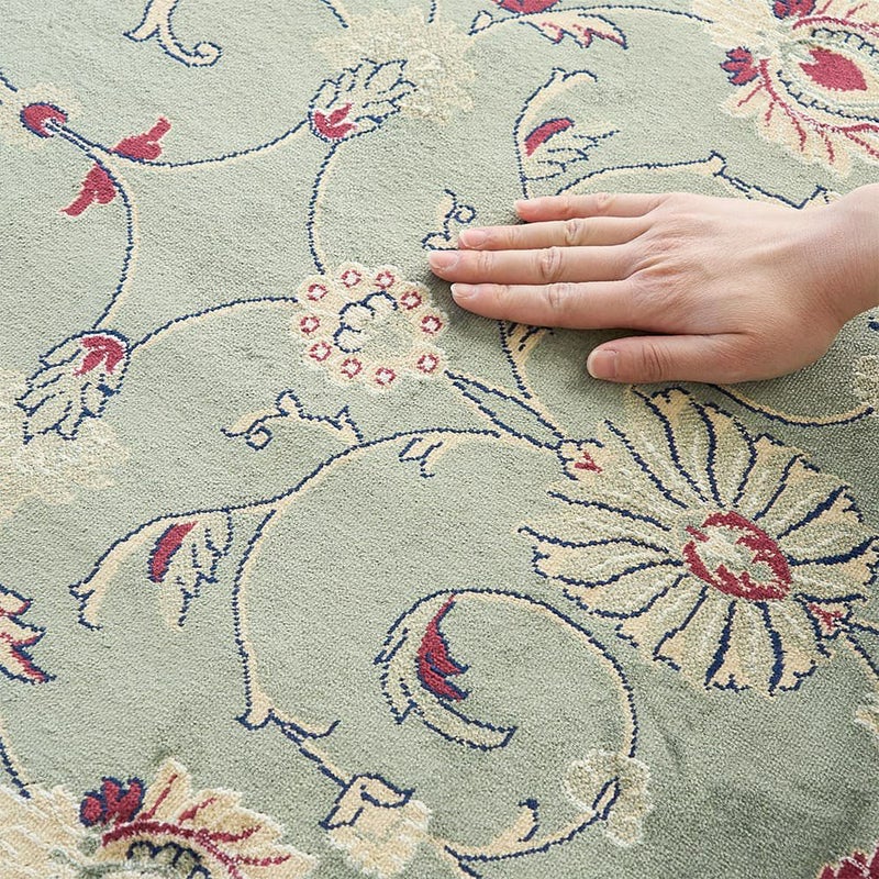 繊細ながらも存在感のある草花の模様が美しく、グリーンのベースカラーが相まって優雅な雰囲気ただよう一枚。主張が強すぎないデザインで、ナチュラルやアンティークの様々なインテリアテイストとも組み合わせやすいラグです。