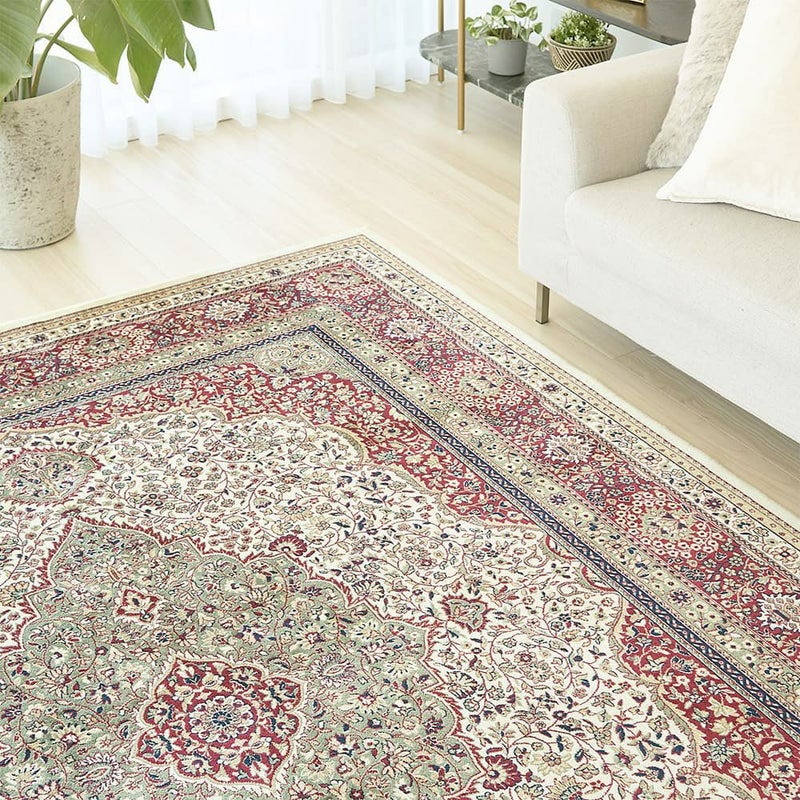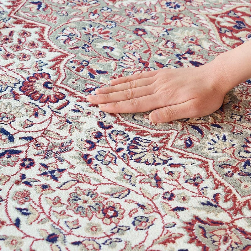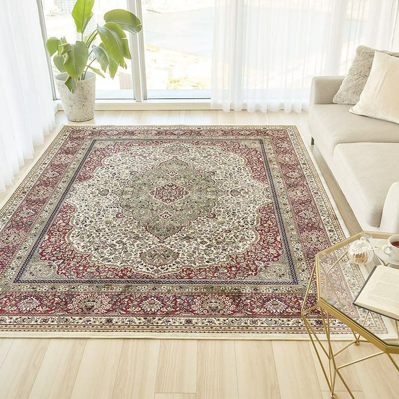 緻密なアラベスク模様は華やかでありつつ、シックで上品な色合いでまとめられており、大人のエレガンスさを感じる一枚。いつものお部屋をホテルライクなラグジュアリー空間にしてみてはいかがでしょうか。