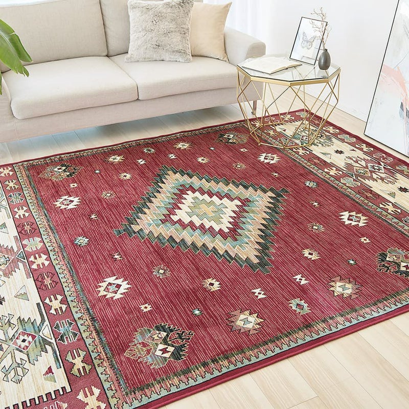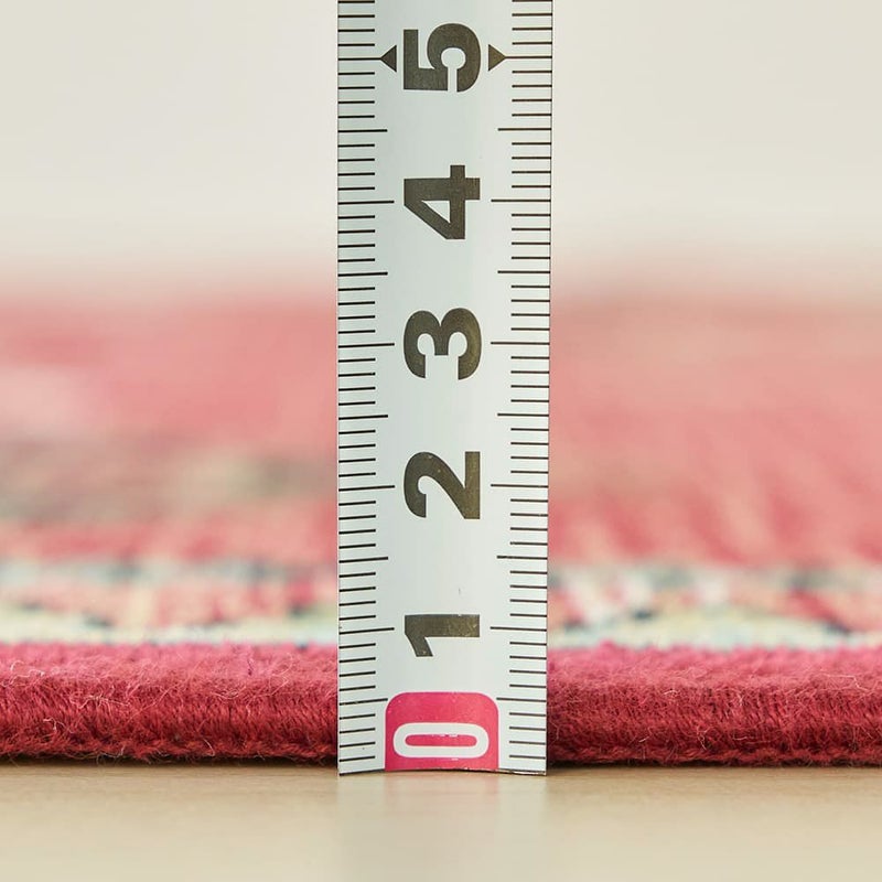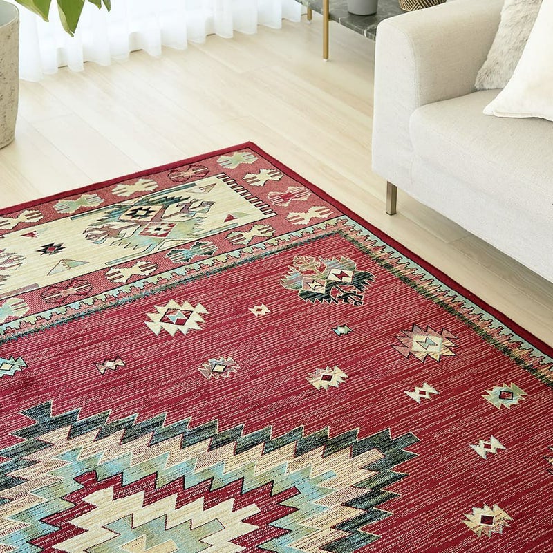 ビビットな配色のイメージが強いキリム柄を、深みのあるレッドでシンプルにまとめたデザインは、幅広いインテリアにマッチ。こだわりを感じさせる風合いで、空間のアクセントになってくれます。
