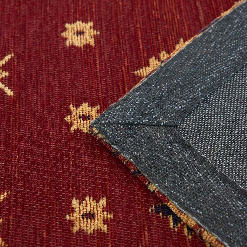 深みのある赤を基調とした落ち着いた色使いと、きらびやかな民族柄が絶妙にマッチしたデザインはヴィンテージ感のある家具はもちろん、幅広いテイストのインテリアにピッタリ。こだわりを感じさせる一枚です。