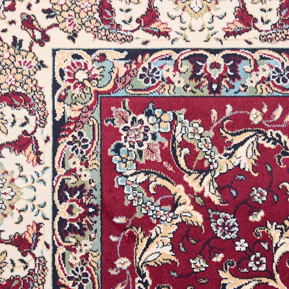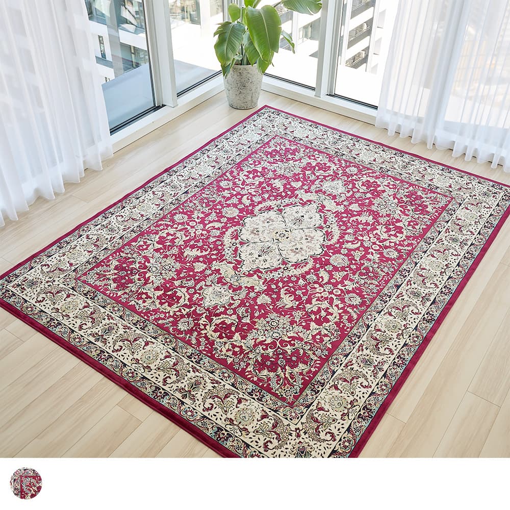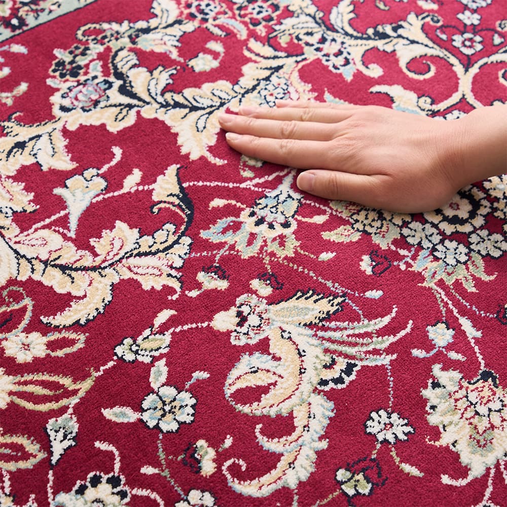 細部にこだわり精密にデザインされた草花のメダリオン模様は、思わず心奪われる美しさ。シックなレッド×アイボリーの重厚感ただよう色使いで、いつものお部屋を格上げしてくれる一枚です。