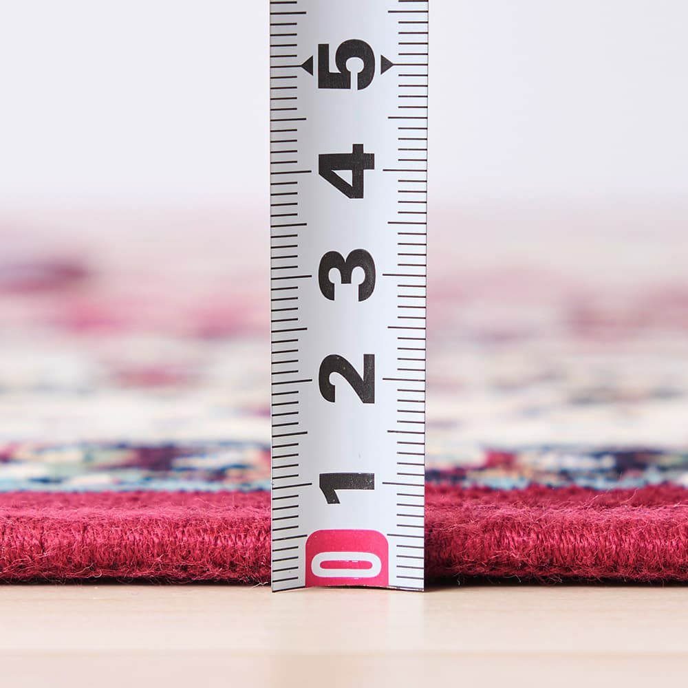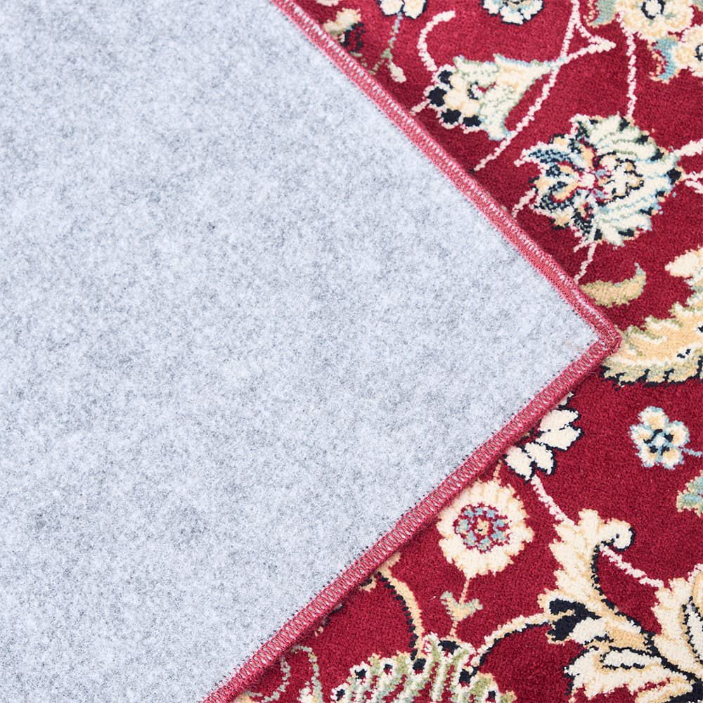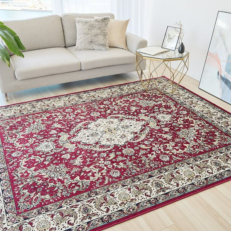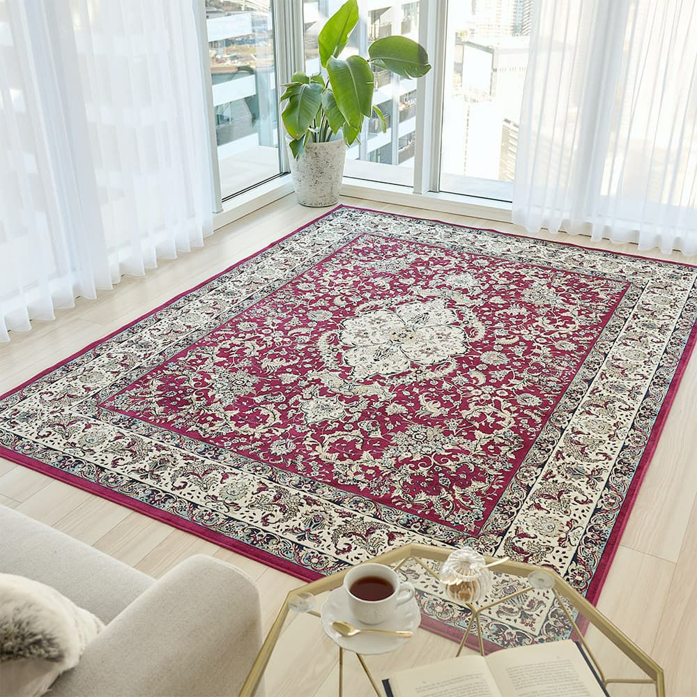 細部にこだわり精密にデザインされた草花のメダリオン模様は、思わず心奪われる美しさ。シックなレッド×アイボリーの重厚感ただよう色使いで、いつものお部屋を格上げしてくれる一枚です。