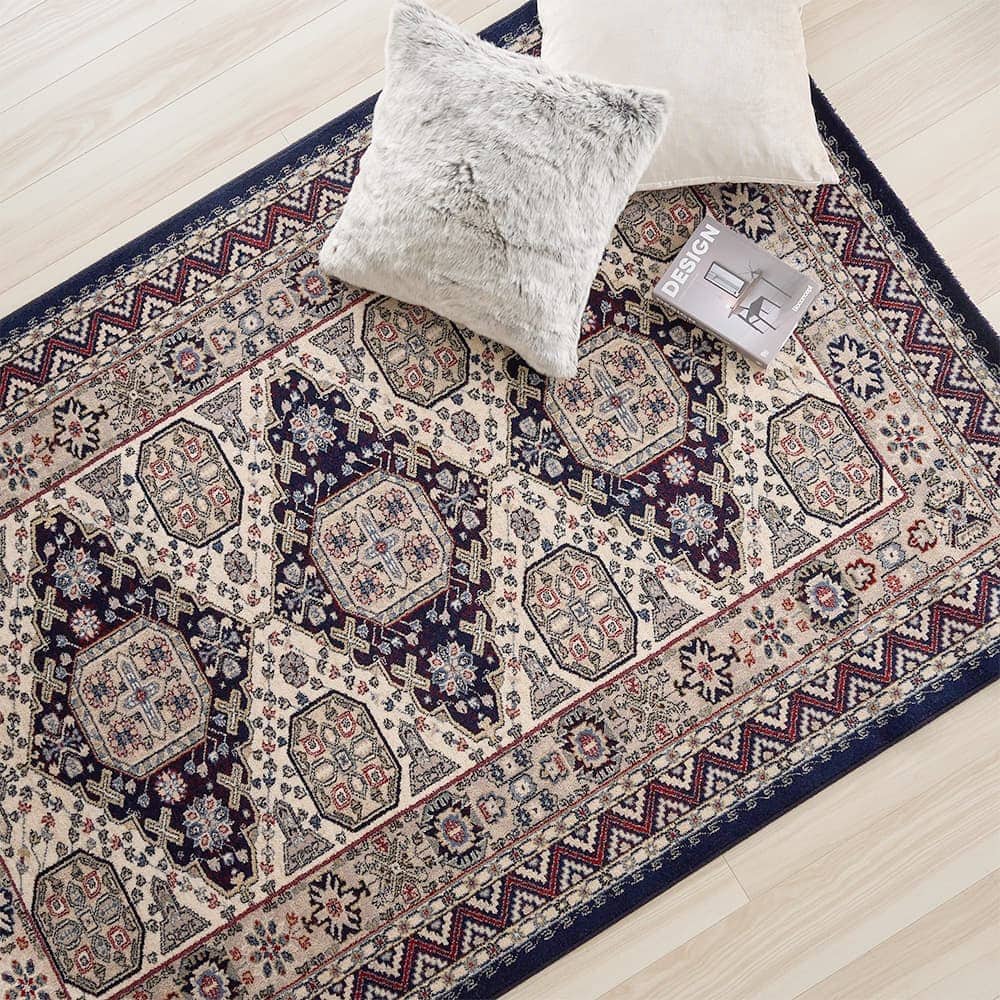 ウィルトン織りのラグには、メダリオン柄等の華やかなデザインが多いのが特徴ですが、無地のラグやギャッベ柄などもあります。