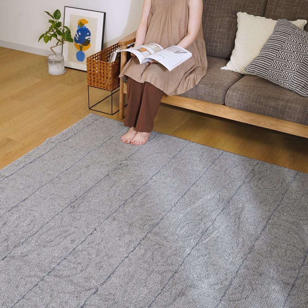 調湿効果が梅雨のじめじめ感を解消し、さらっとした肌触りが暑いお部屋の対策にも活躍するい草ラグ。