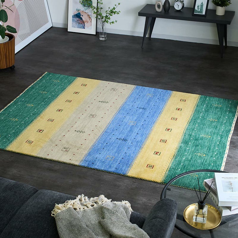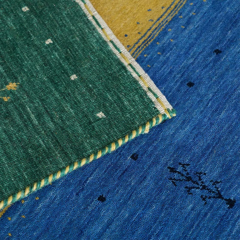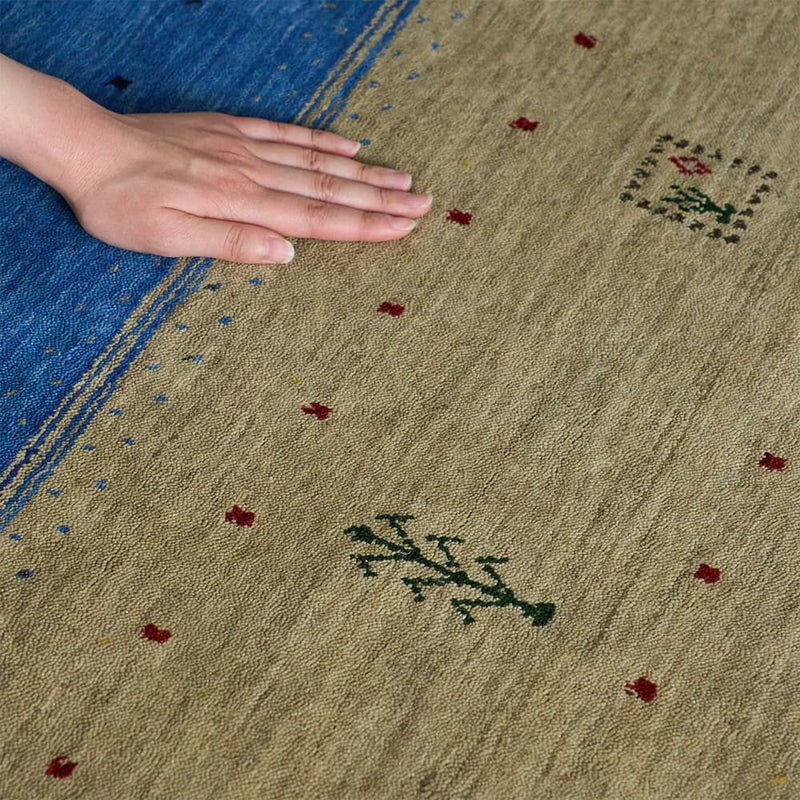ペルシャ地方の伝統敷物「ギャッベ」を、ウールラグで表現した1枚です。木々の緑や泉の青、陽光の黄色を思わせるアースカラーは、爽やかな初夏の風をお部屋に呼び込んでくれるかのよう。ウールの柔らかな風合いとともに、その涼やかで優しい「色」をお楽しみください。