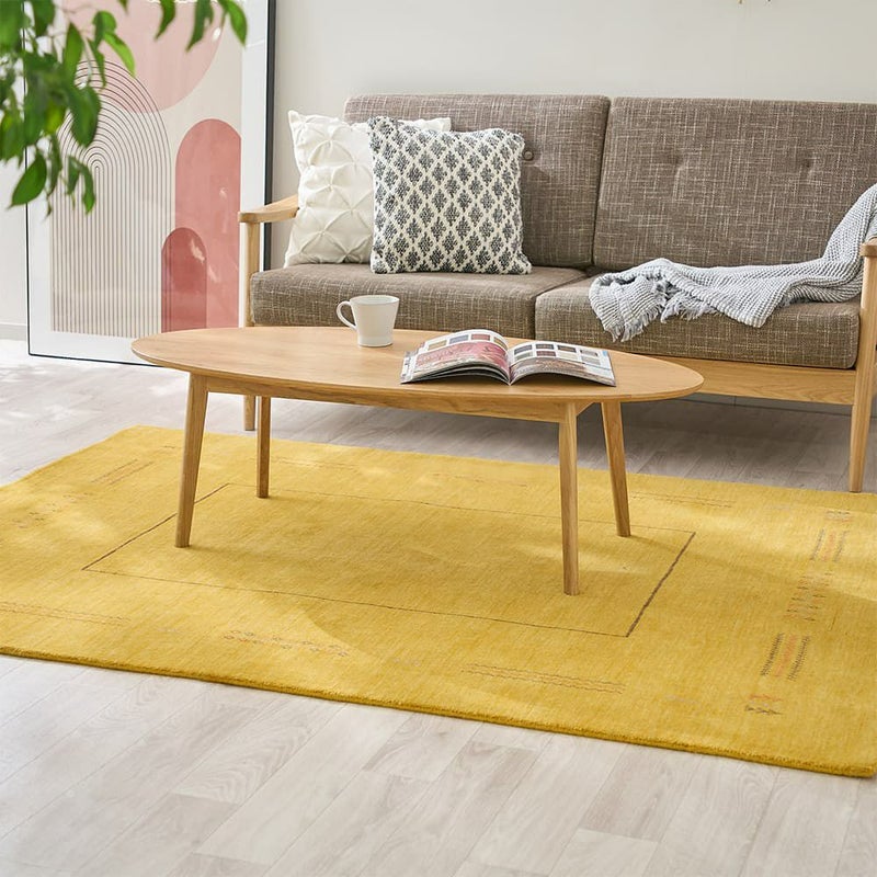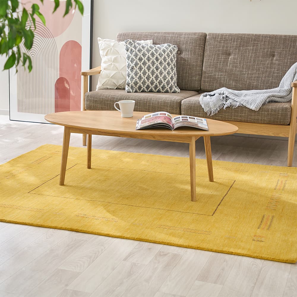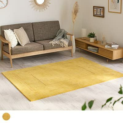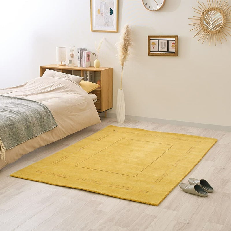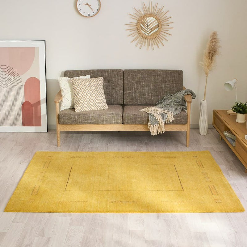 木目によく馴染むナチュラルさもありながら、ぱっとお部屋が華やぐイエローのギャッベラグ。暗すぎず鮮やかすぎない魅惑のマスタードイエローが空間に映えます。ウールを手織りした、高品質な風合いも魅力の1枚です。