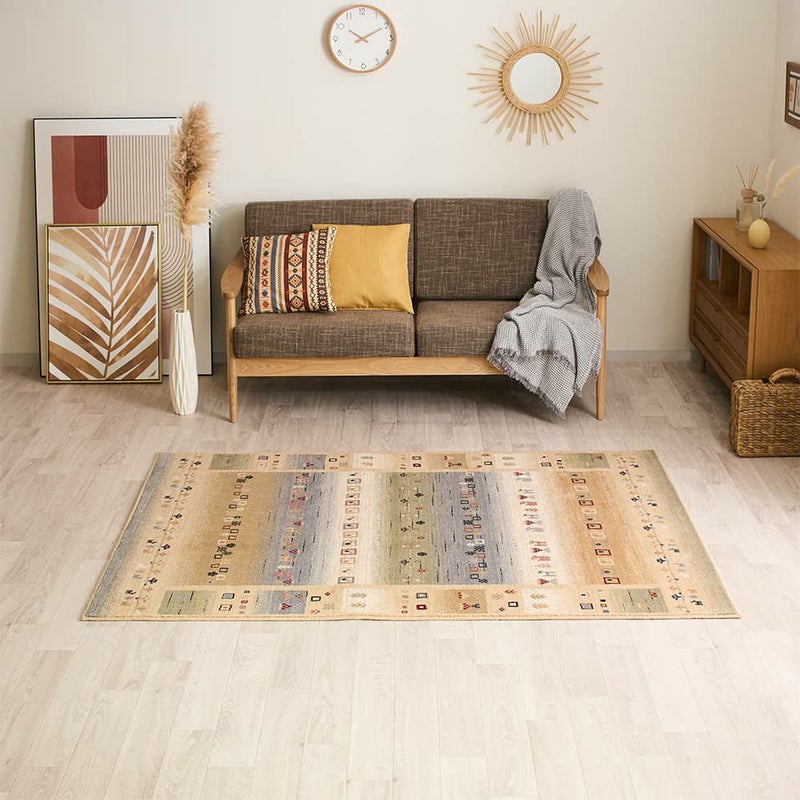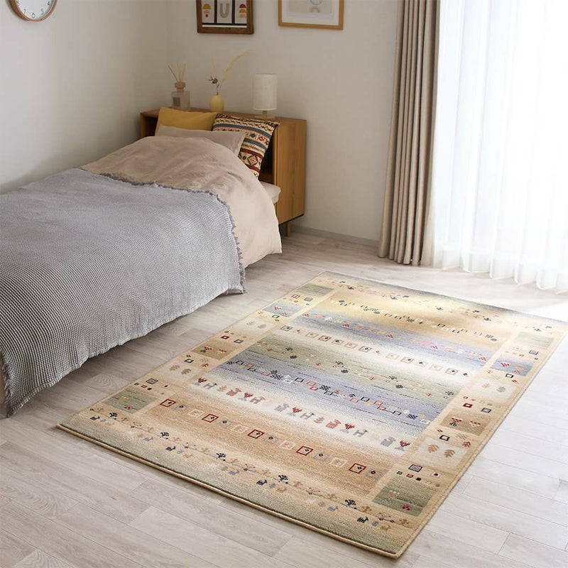 中東エリアの遊牧民の暮らしを描いた、ギャッベ柄のウィルトン織ラグです。雄大に広がる自然の風景が、白みだした夜明けから明るい日中、夕暮れまで時をかけて移ろっていくような美しいグラデ―ションも魅力。優しい色合わせが高品質のウールによく映え、素朴なエスニック調をお部屋に運んでくれる1枚です。