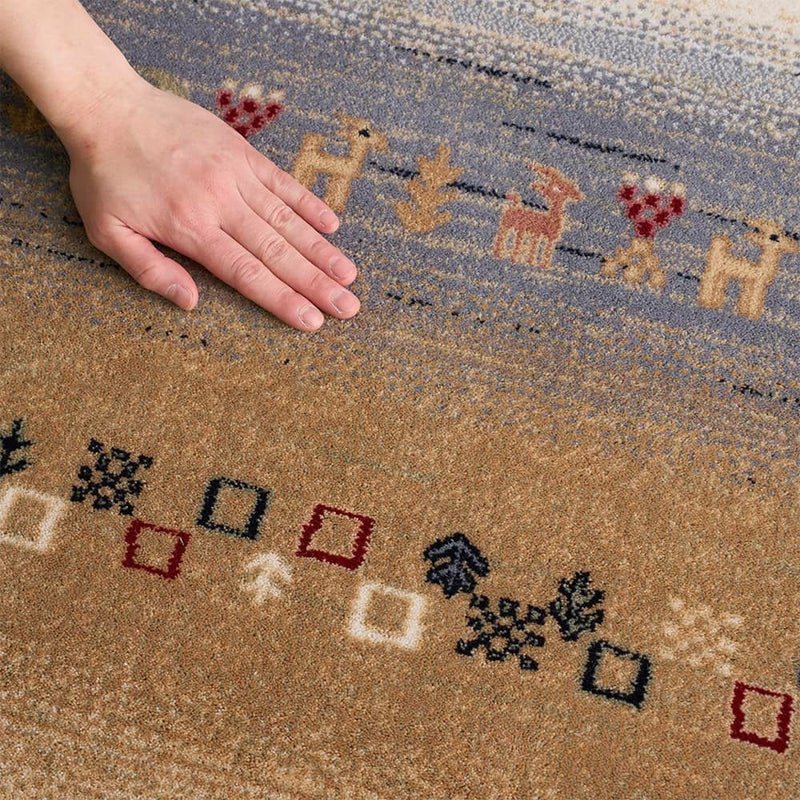 エスニックな雰囲気で人気の「ギャッベ柄」は、元々遊牧民の暮らしを表現したもので一つ一つの柄に願いが込められています。こちらの1枚には、家族を表す「鹿」幸せを呼び込む窓を示す「四角」健康や長生きを表現した「生命の木」などが描かれている点にもご注目ください。