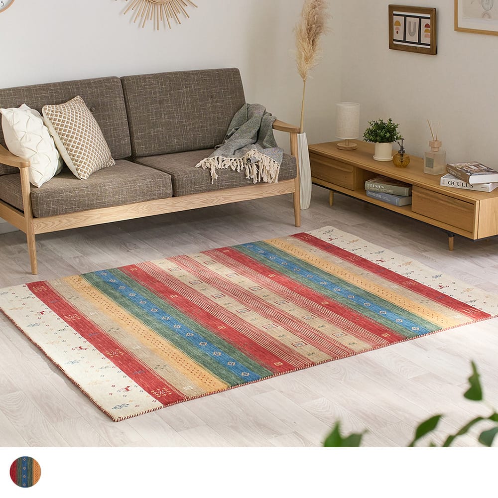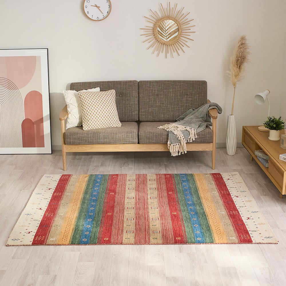 カラフルなマルチボーターとリズミカルなギャッベ柄が、陽気な風景を見せてくれるラグ「ランバン」お部屋の中に1枚置けば、ちょっぴり憂鬱モードな日も前向きな気持ちにさせてくれそうです。